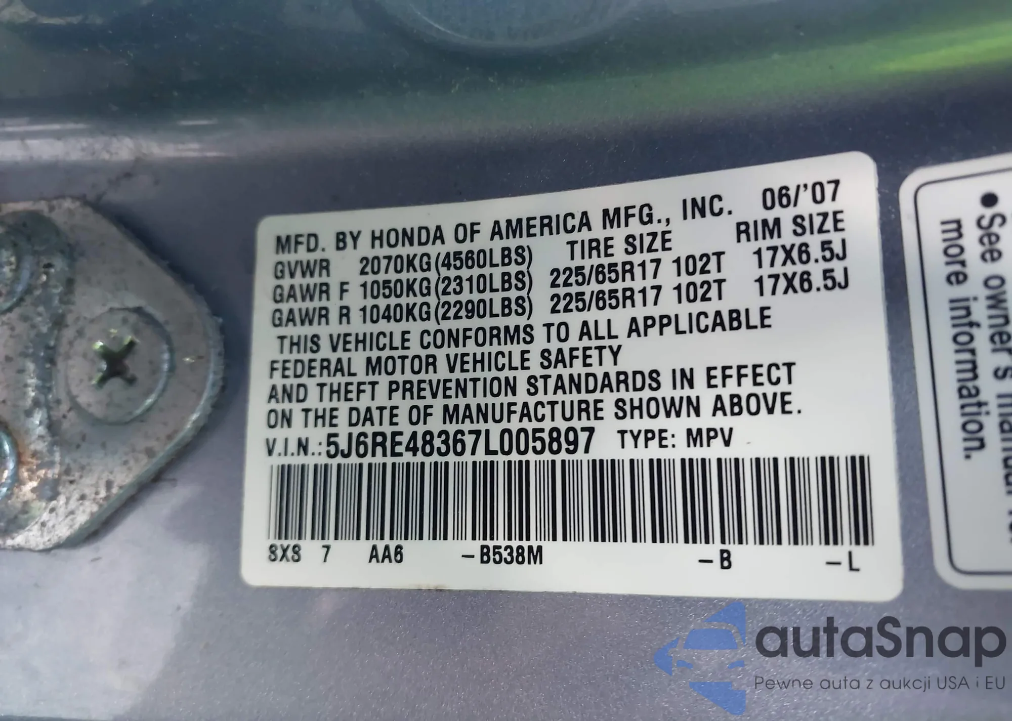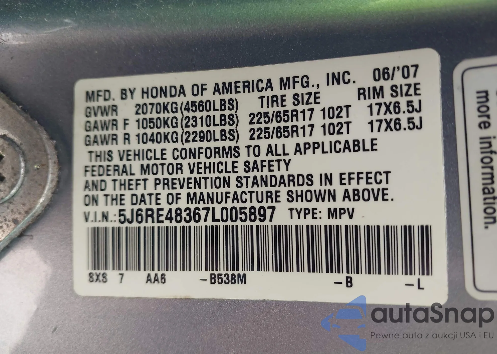 • VIN 5J6RE48367L005897