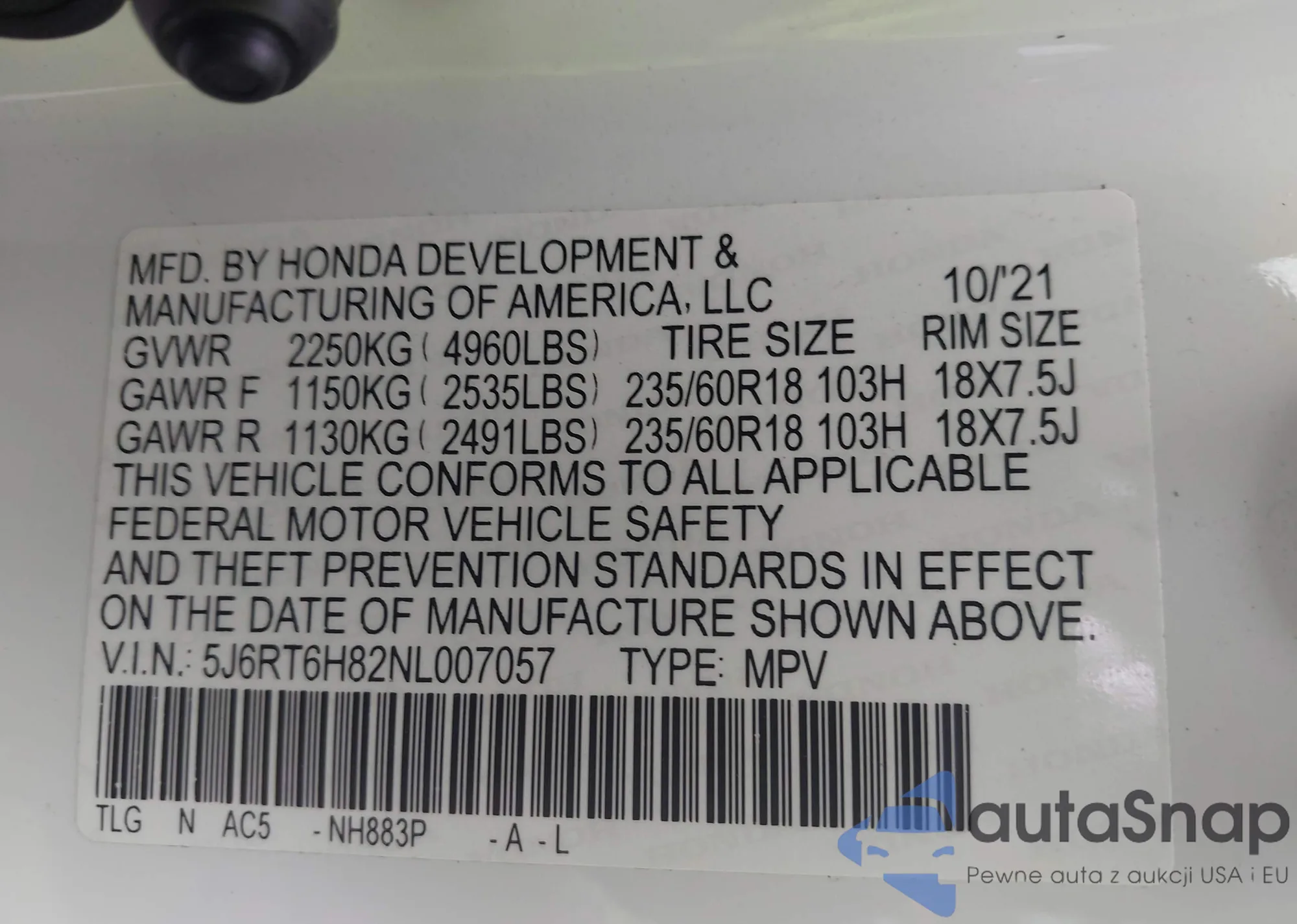 • VIN 5J6RT6H82NL007057