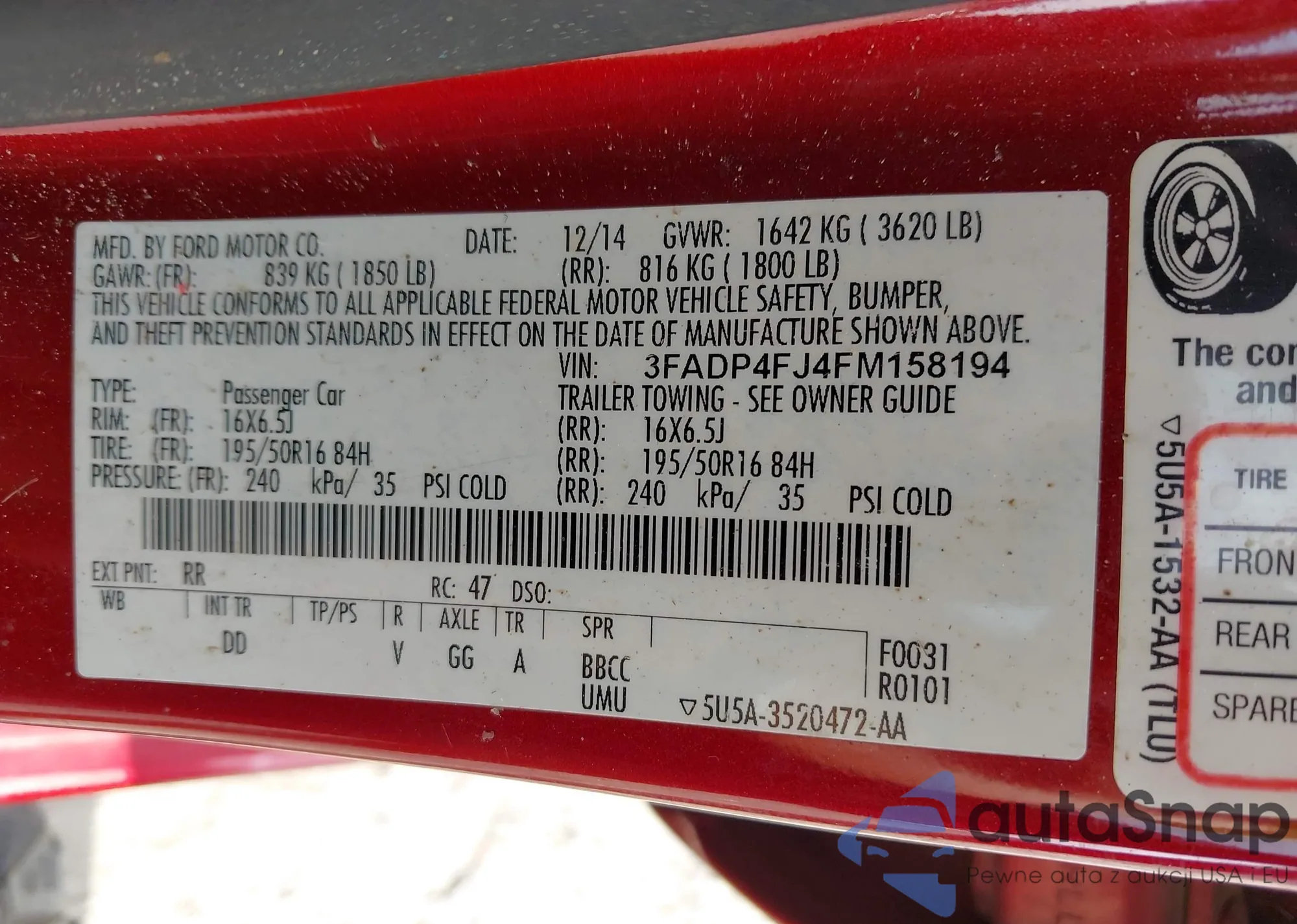 LOT: 42680978 VIN: 3FADP4FJ4FM158194