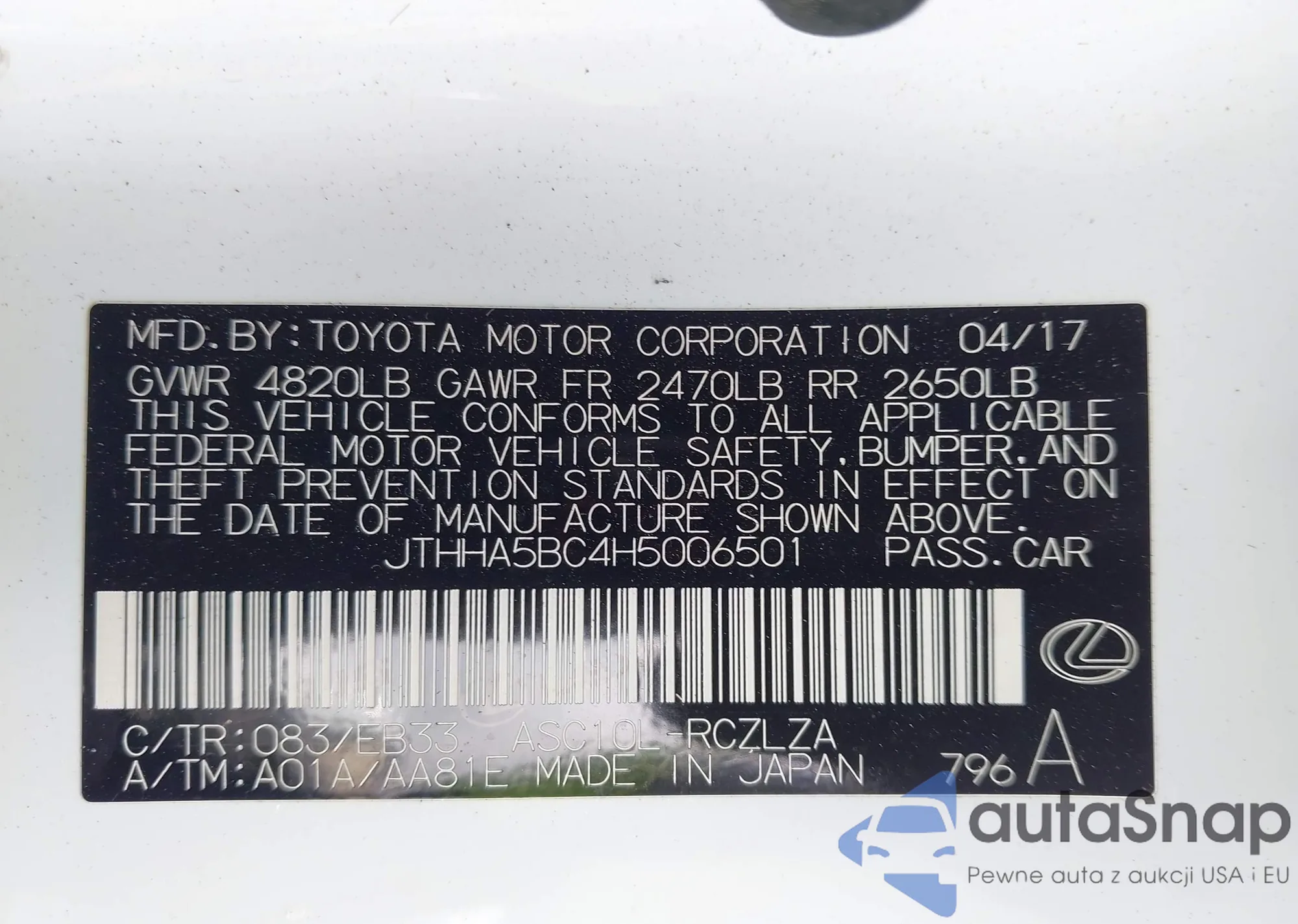 • VIN JTHHA5BC4H5006501