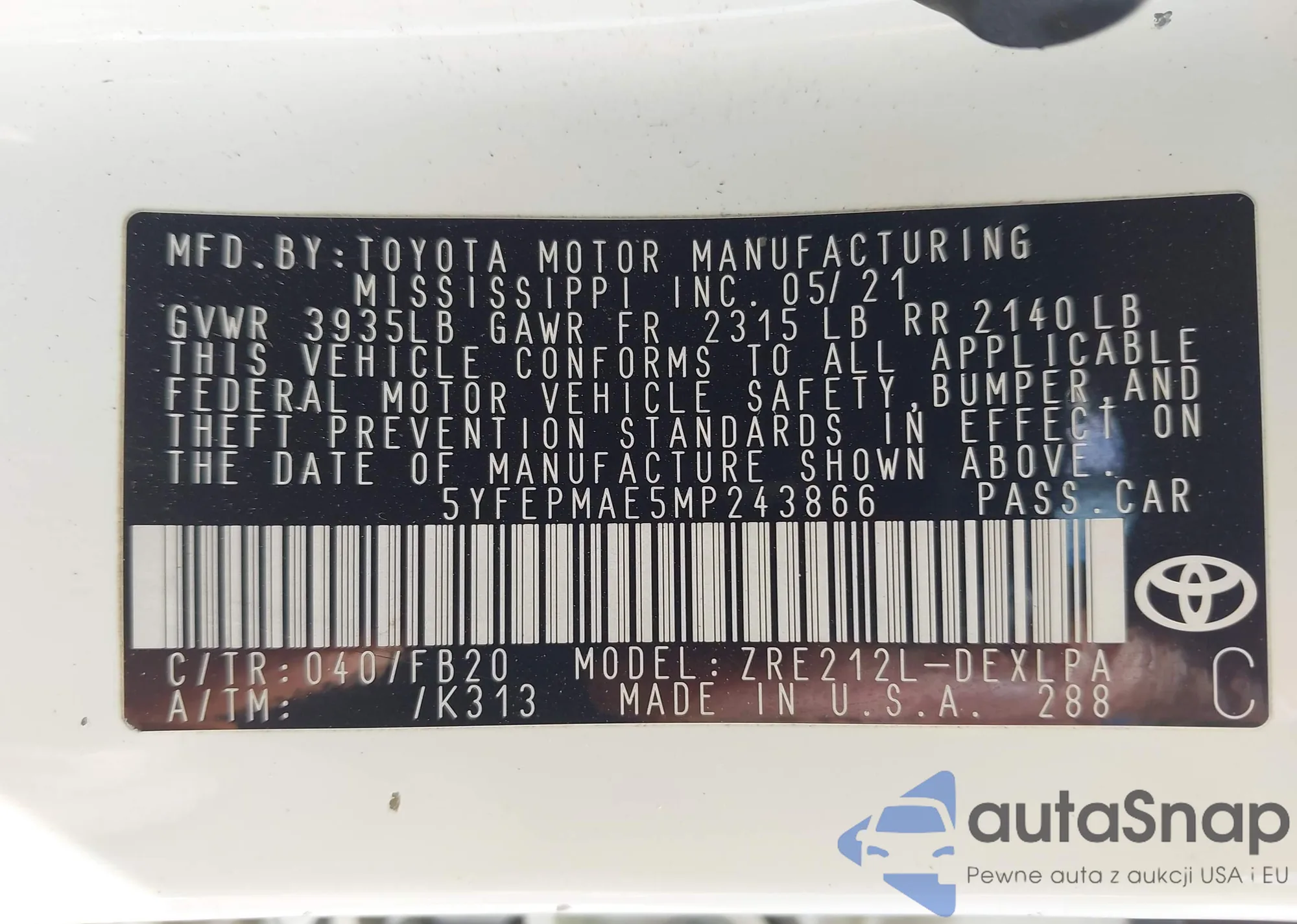 LOT: 43104051 VIN: 5YFEPMAE5MP243866
