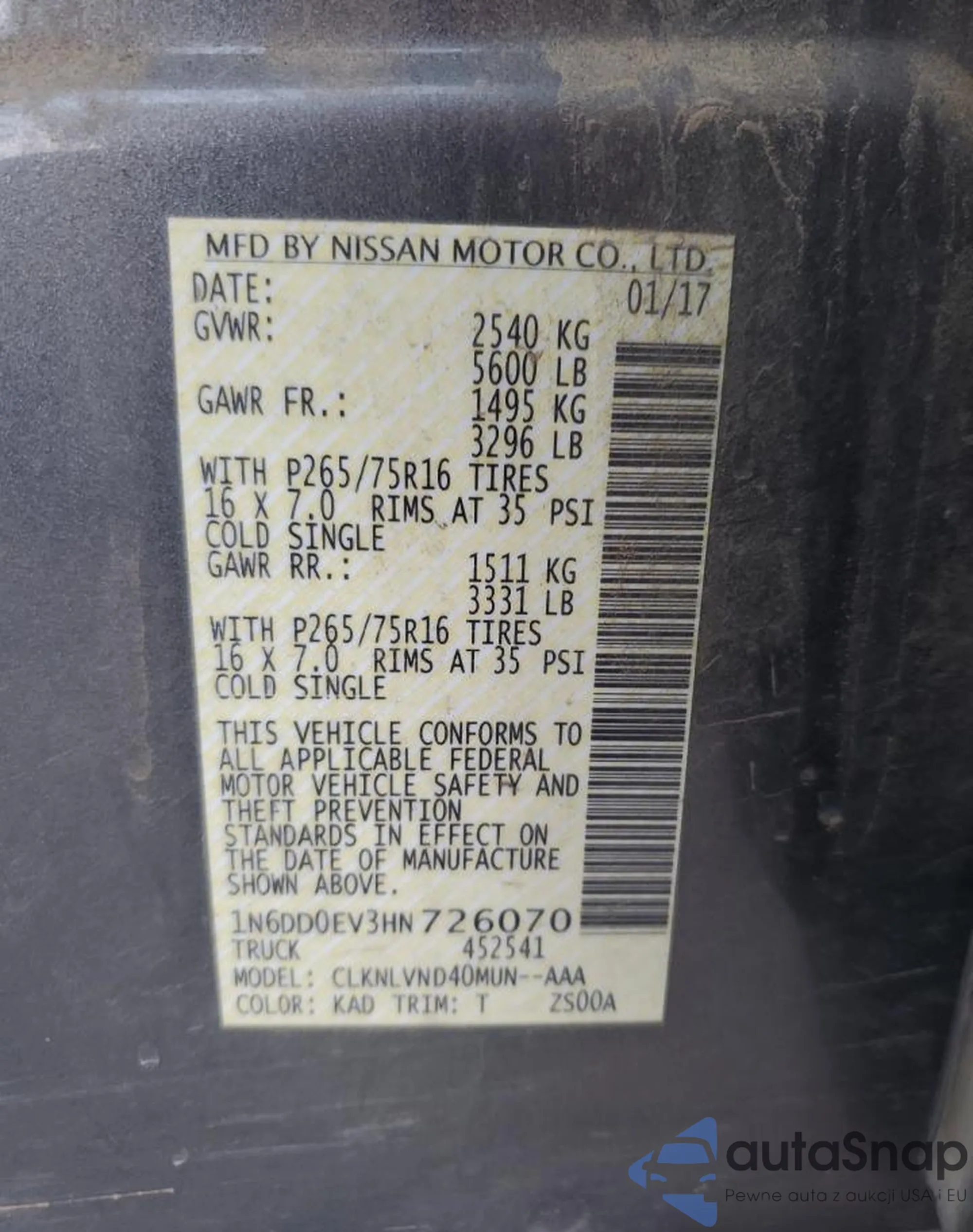 • VIN 1N6DD0EV3HN726070
