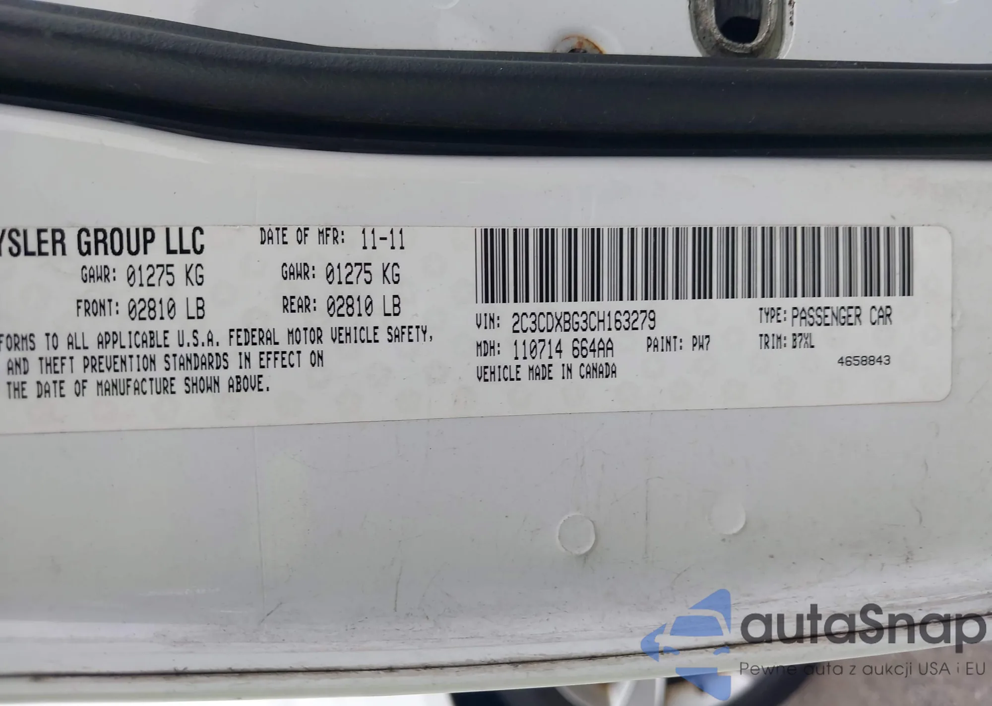 LOT: 43018358 VIN: 2C3CDXBG3CH163279
