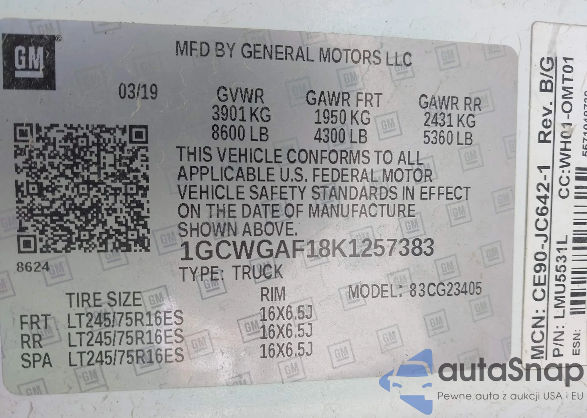 LOT: 43003469 VIN: 5YJ3E1EB5KF387261
