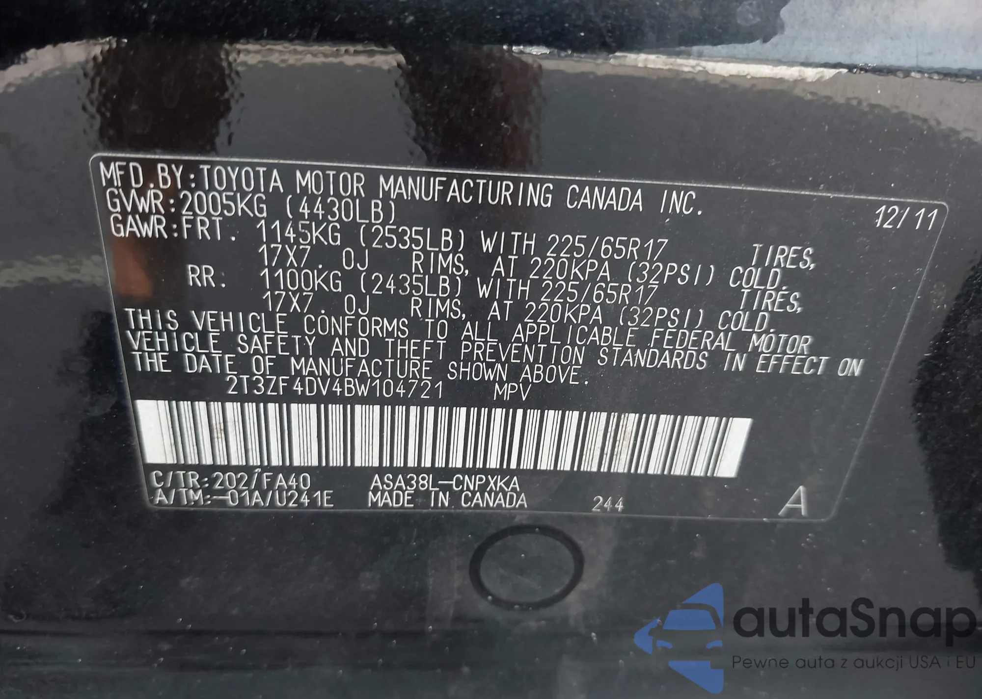 LOT: 43137861 VIN: 2T3ZF4DV4BW104721