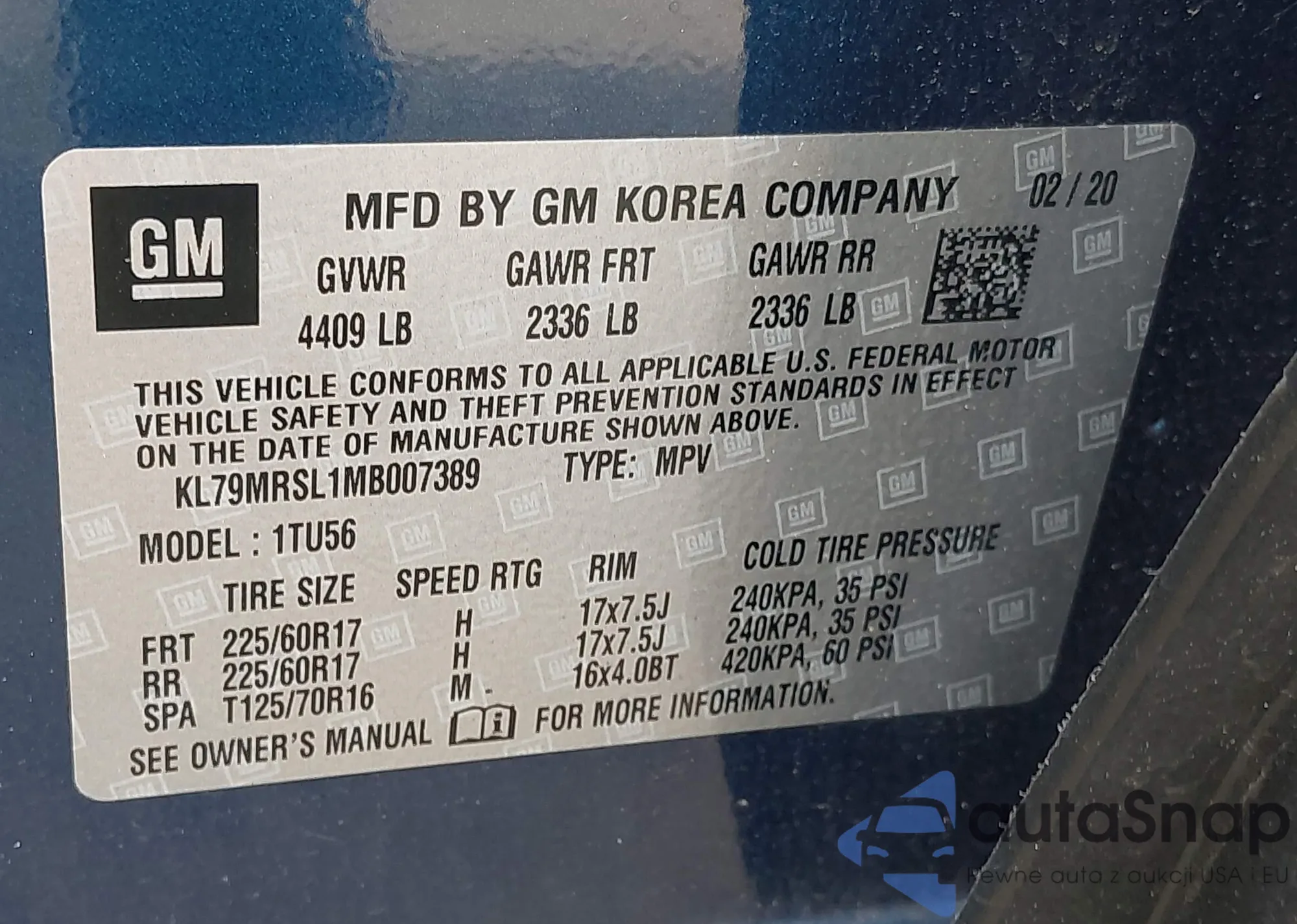 • VIN KL79MRSL1MB007389