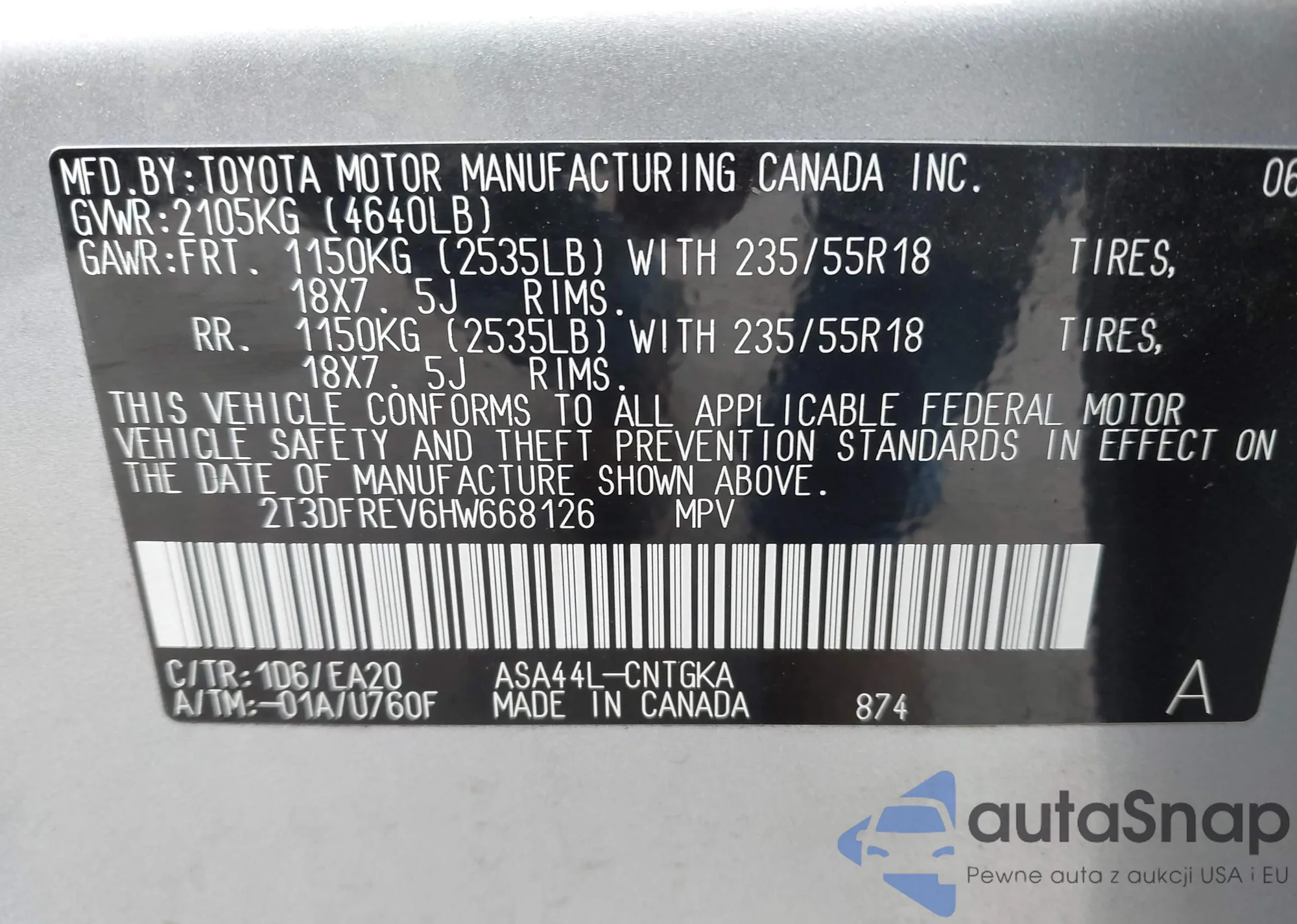 • VIN 2T3DFREV6HW668126