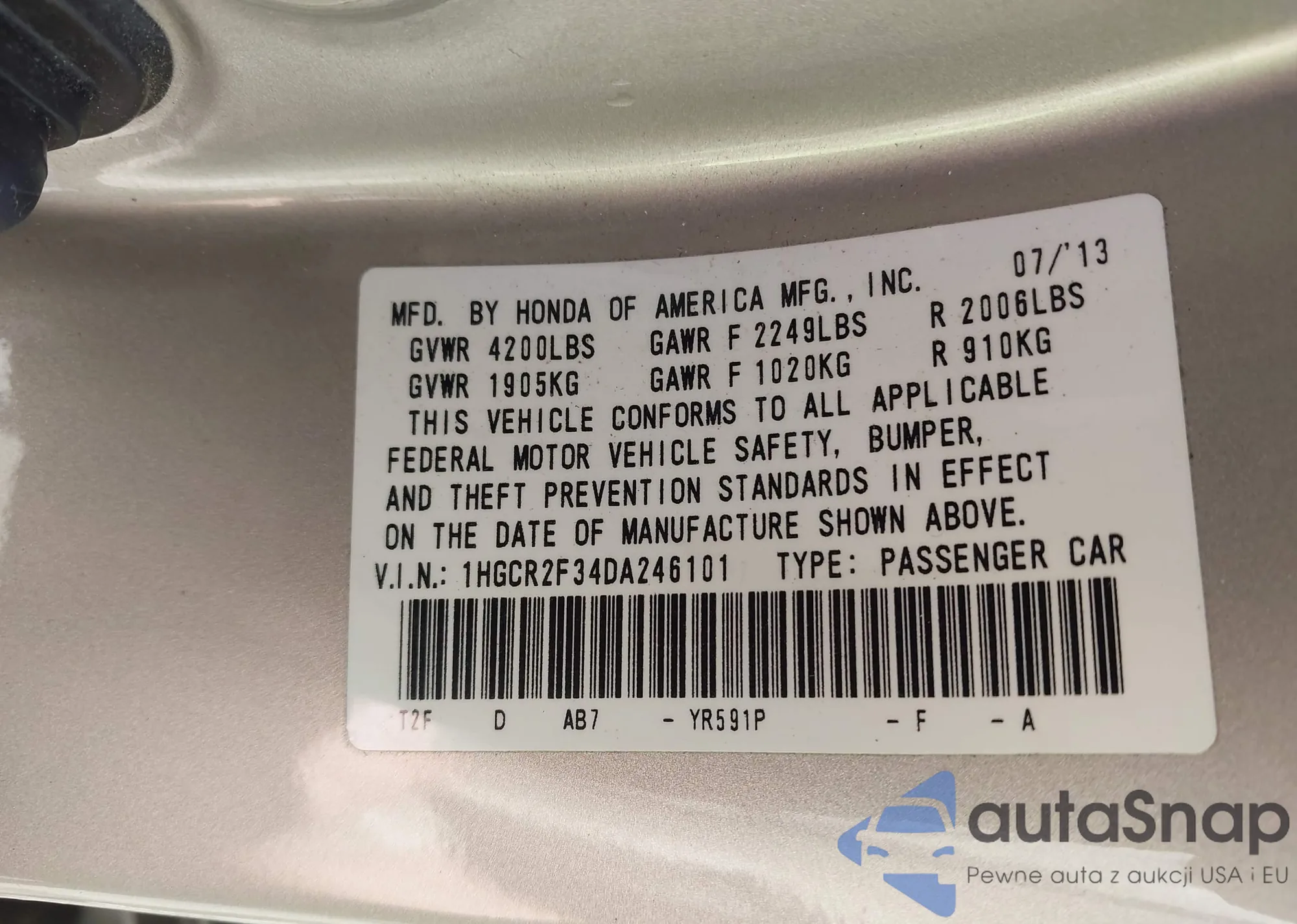 LOT: 43095059 VIN: 1HGCR2F34DA246101