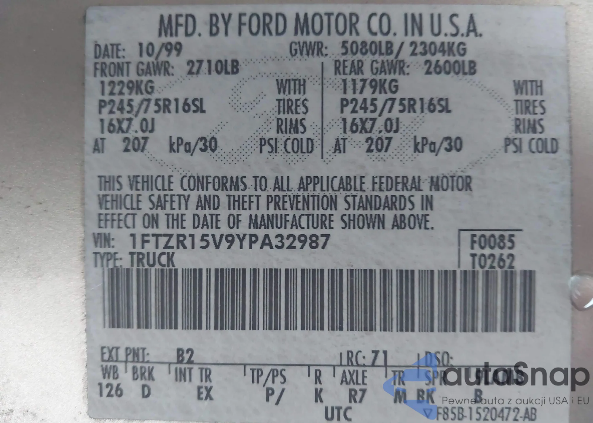 LOT: 43192115 VIN: 1FTZR15V9YPA32987