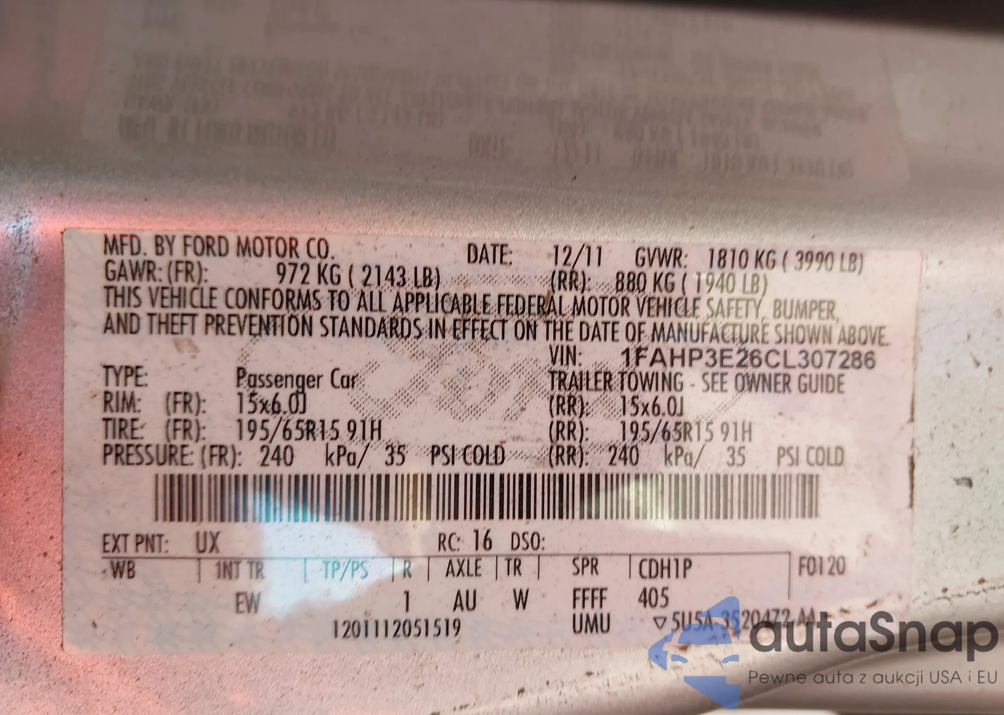 LOT: 42786351 VIN: 1FAHP3E26CL307286