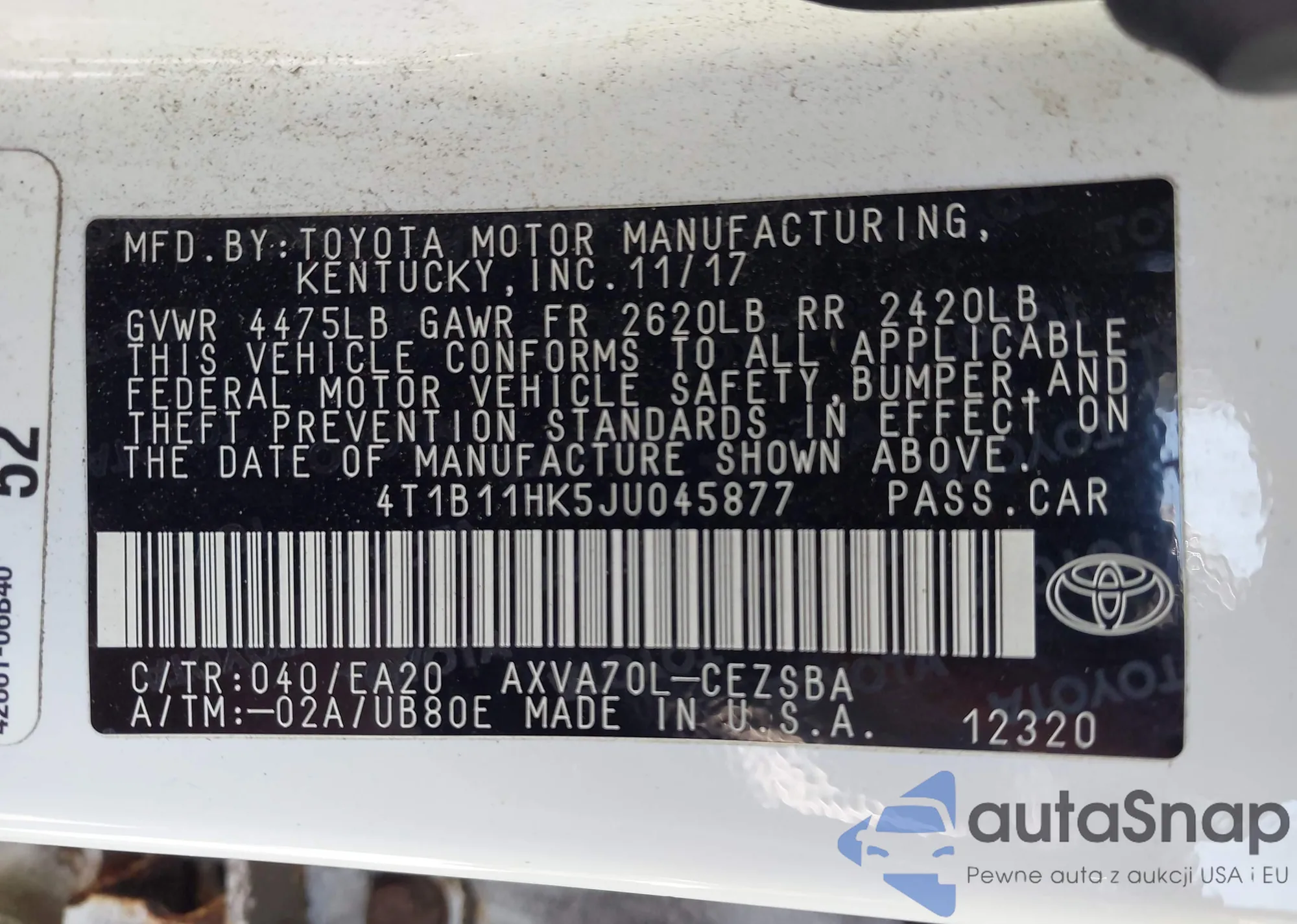 LOT: 42926619 VIN: 4T1B11HK5JU045877