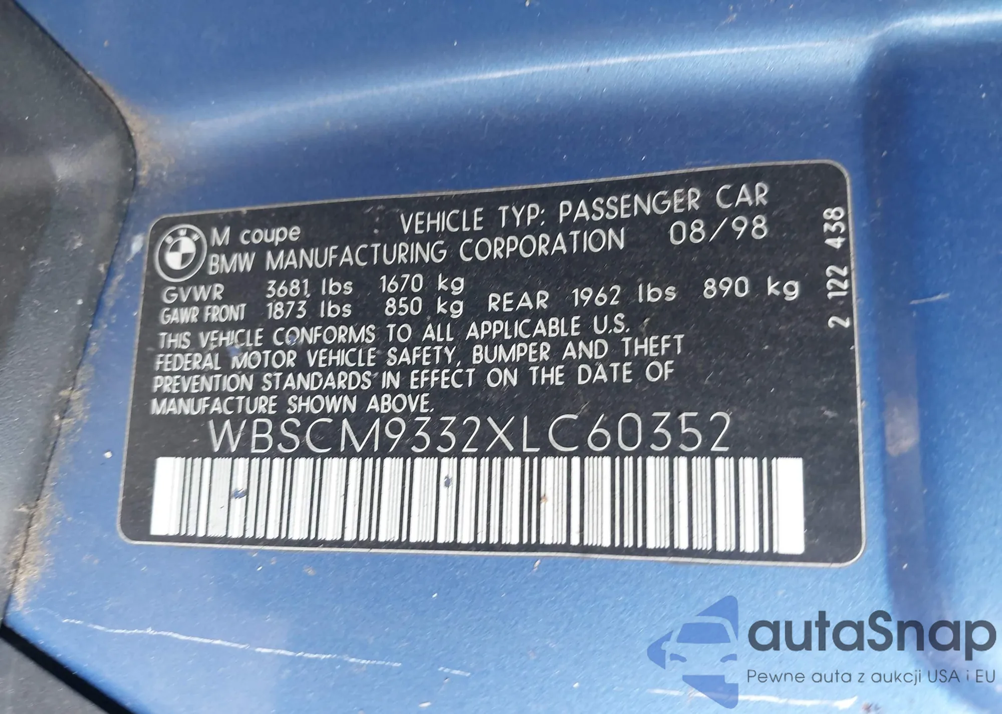 1999 BMW M z USA, uszkodzony, nr VIN WBSCM9332XLC60352