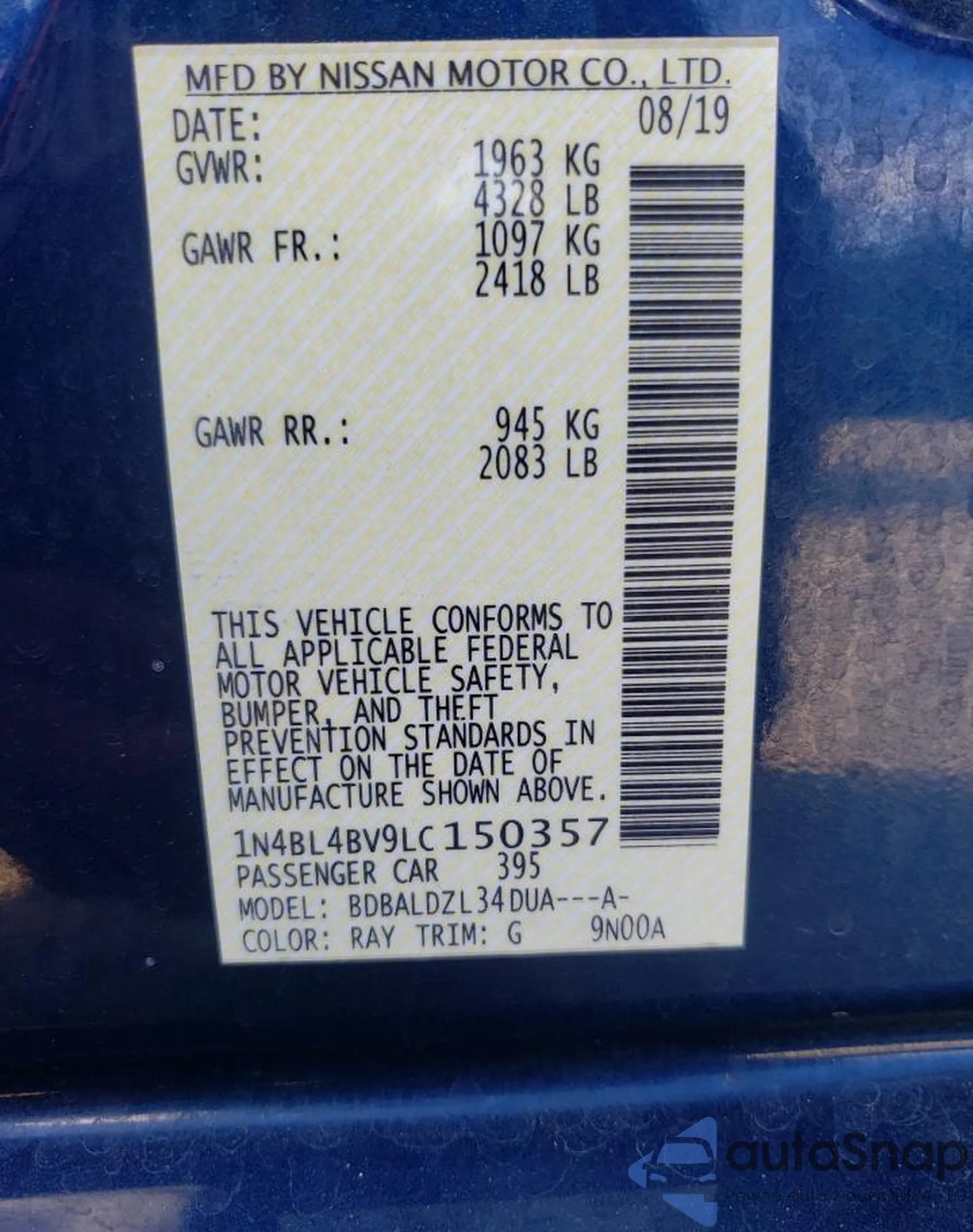 • VIN 1N4BL4BV9LC150357