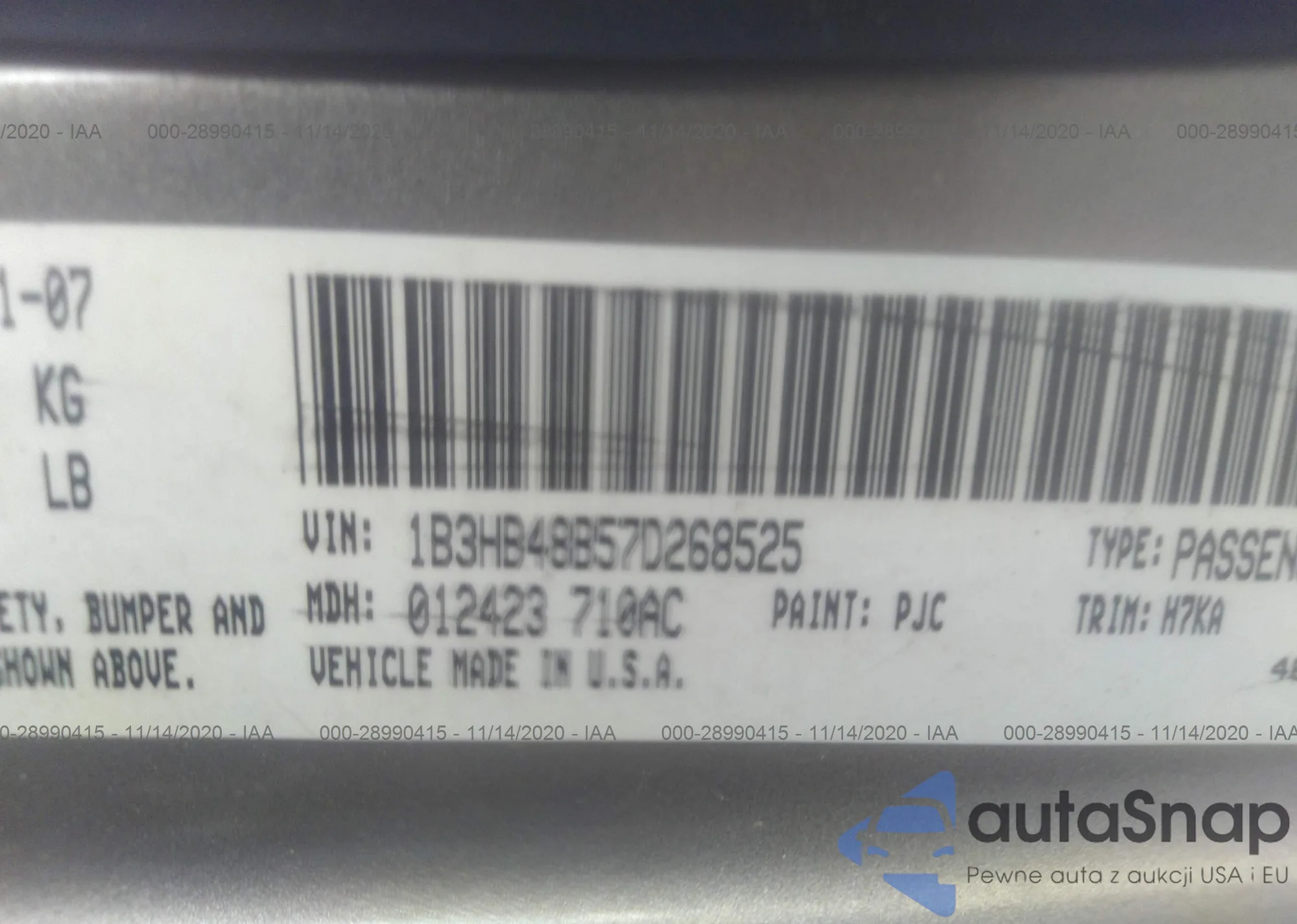 LOT: 28990415 VIN: 1B3HB48B57D268525