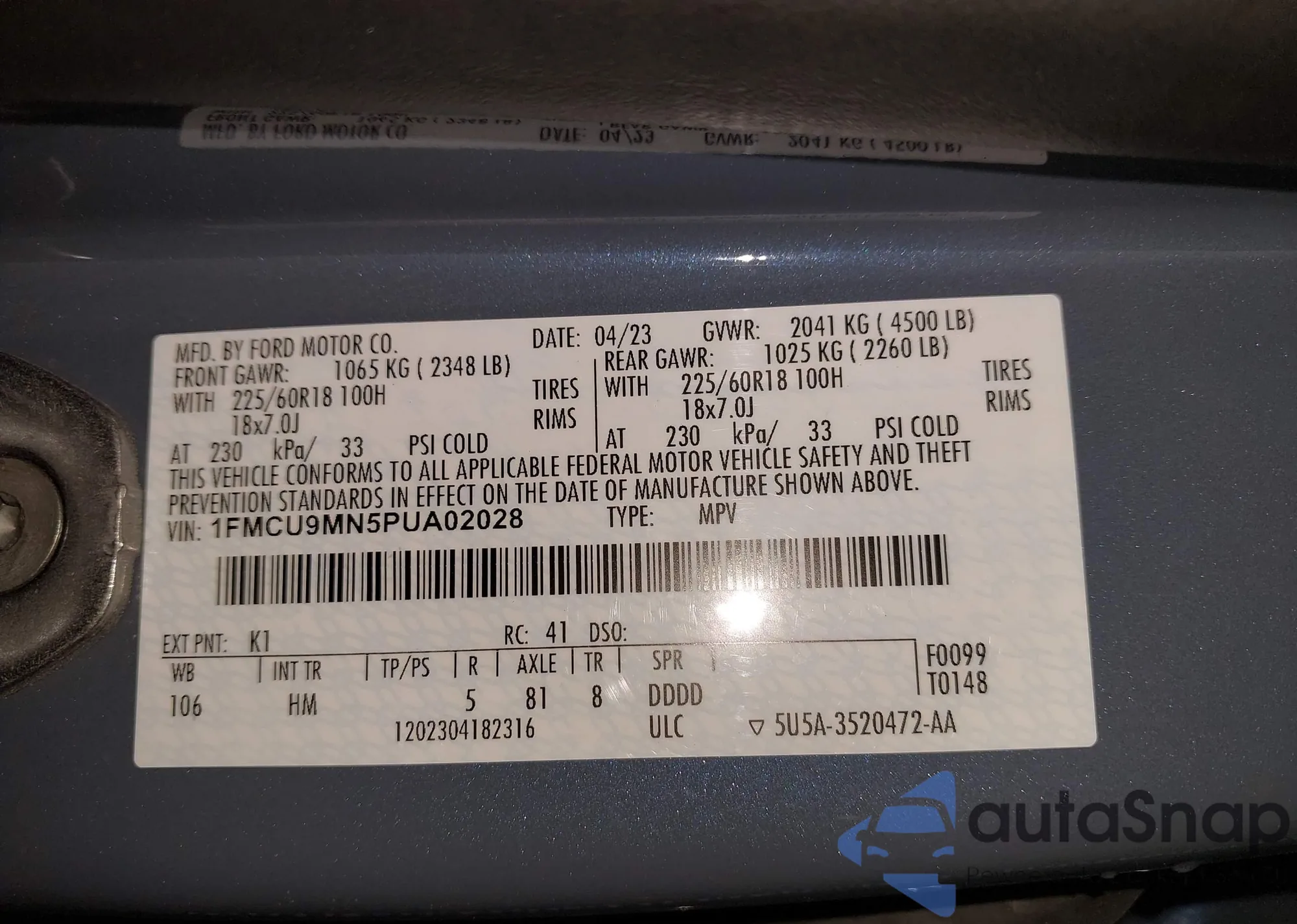 LOT: 43202977 VIN: 1FMCU9MN5PUA02028