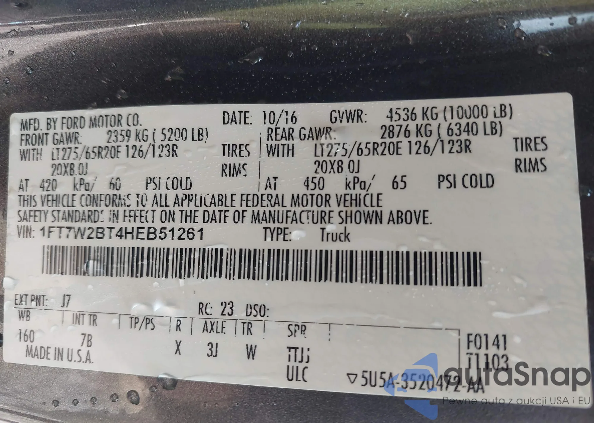 LOT: 43235421 VIN: 1FT7W2BT4HEB51261