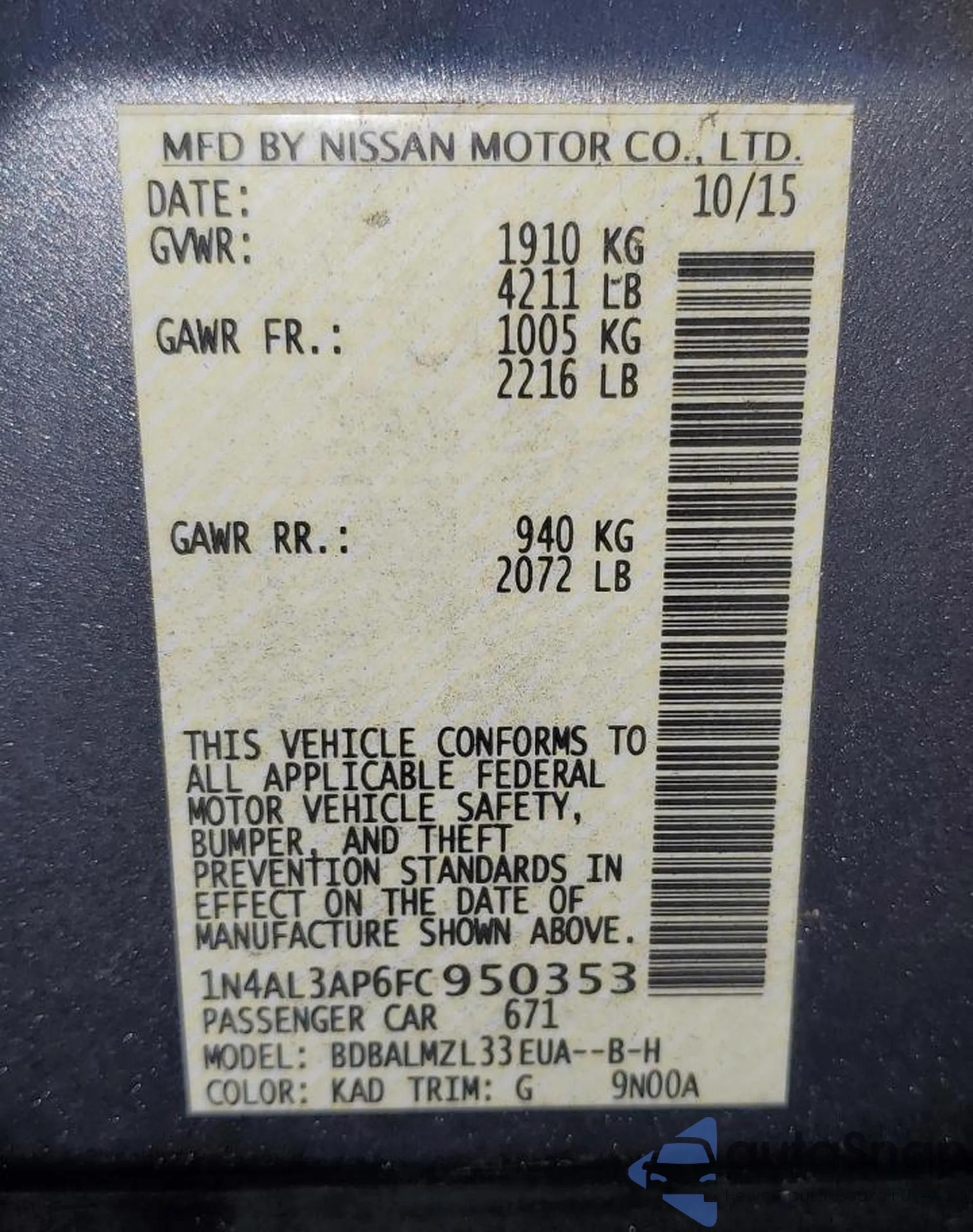 • VIN 1N4AL3AP6FC950353