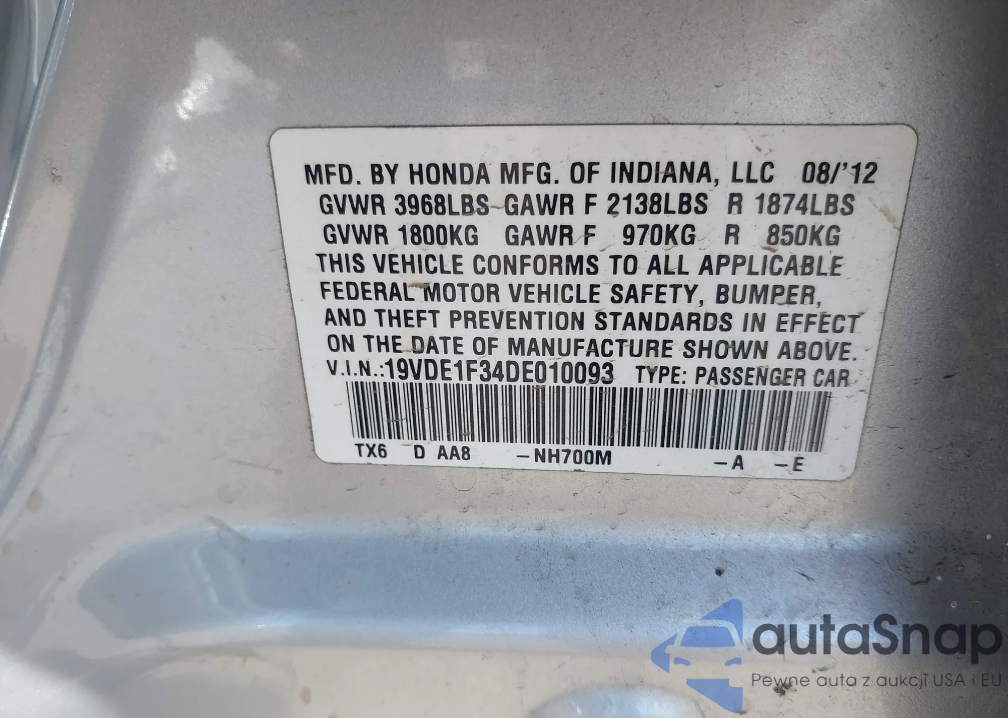 LOT: 43111531 VIN: 19VDE1F34DE010093