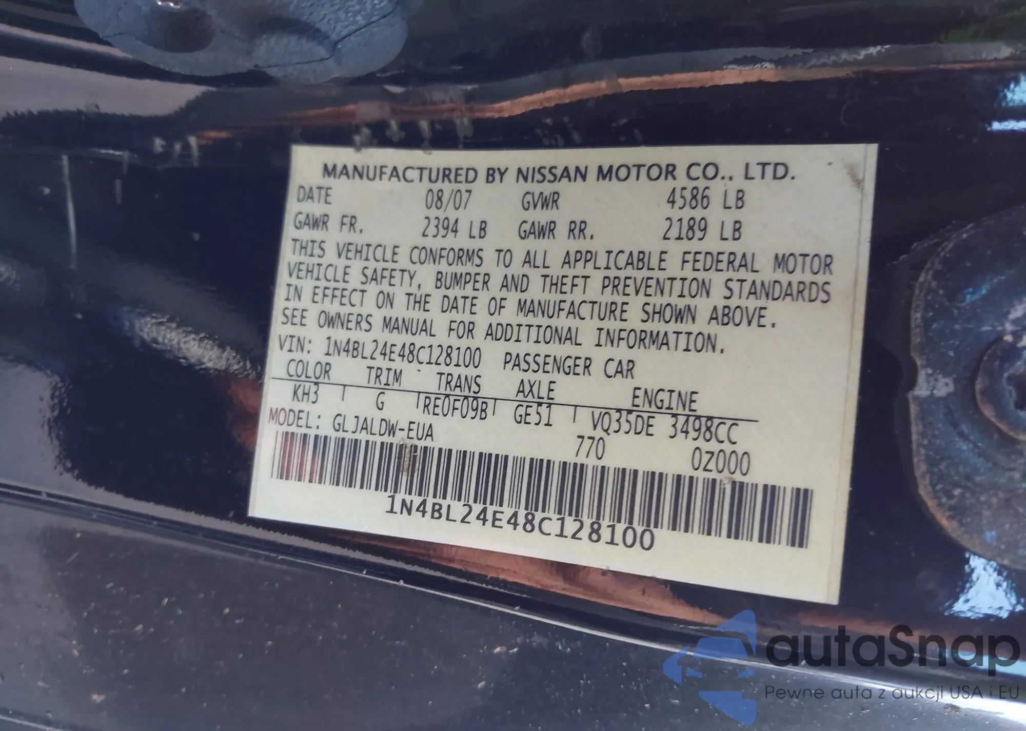 2008 Nissan Altima 3.5 Se z USA, uszkodzony, nr VIN 1N4BL24E48C128100