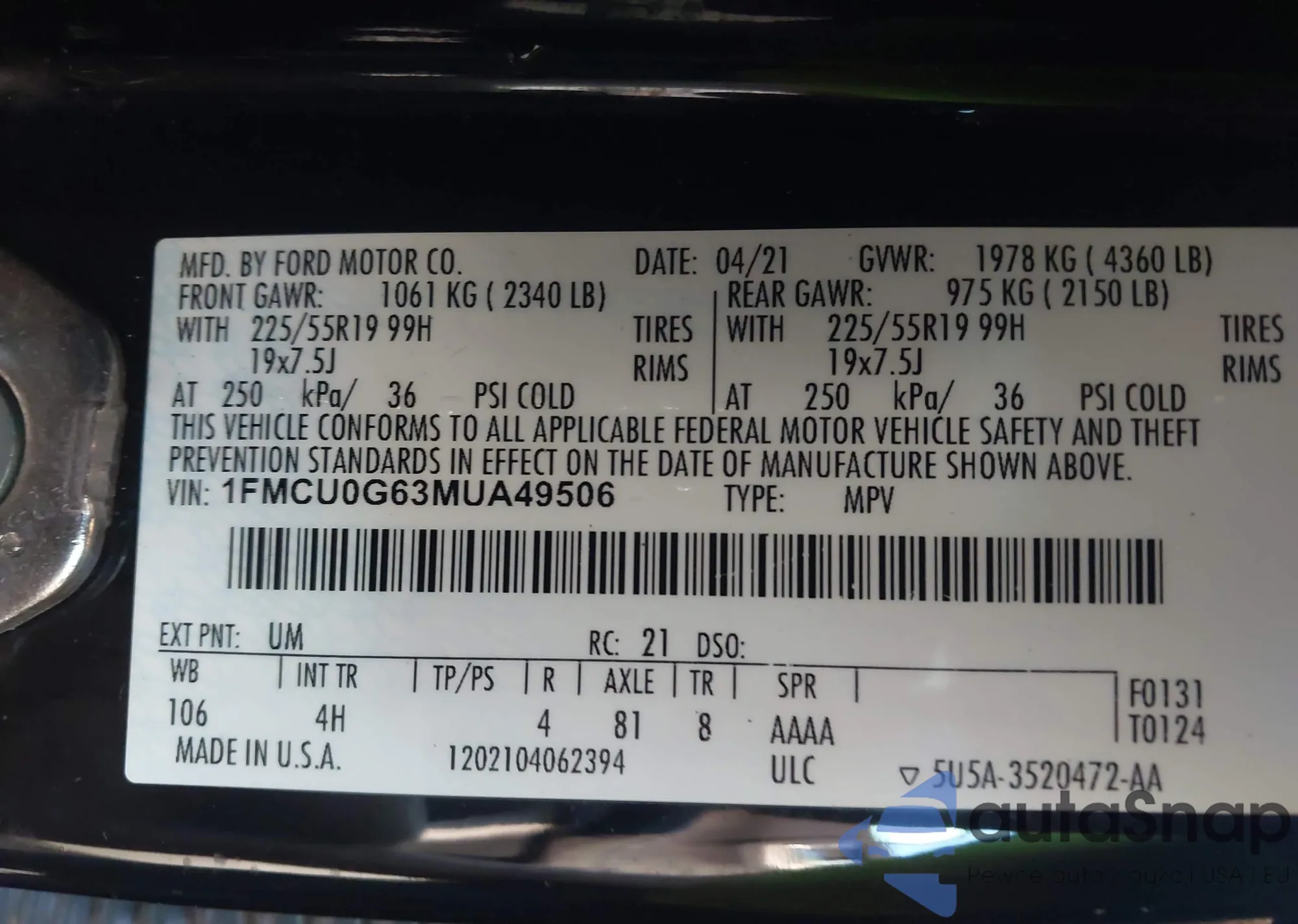 LOT: 43309190 VIN: 1FMCU0G63MUA49506
