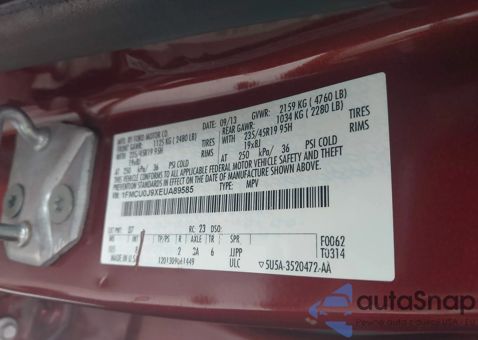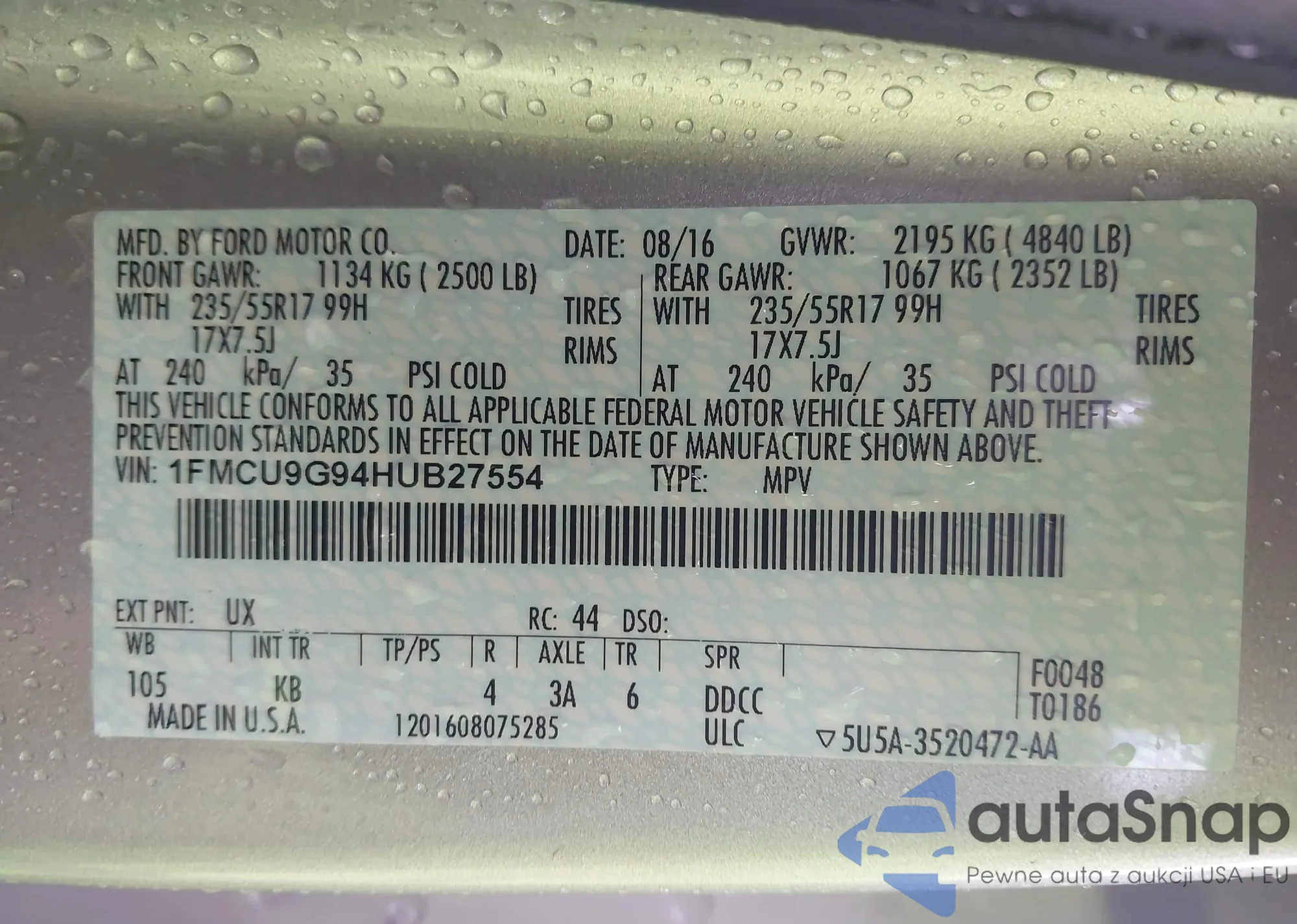 LOT: 43310520 VIN: 1FMCU9G94HUB27554