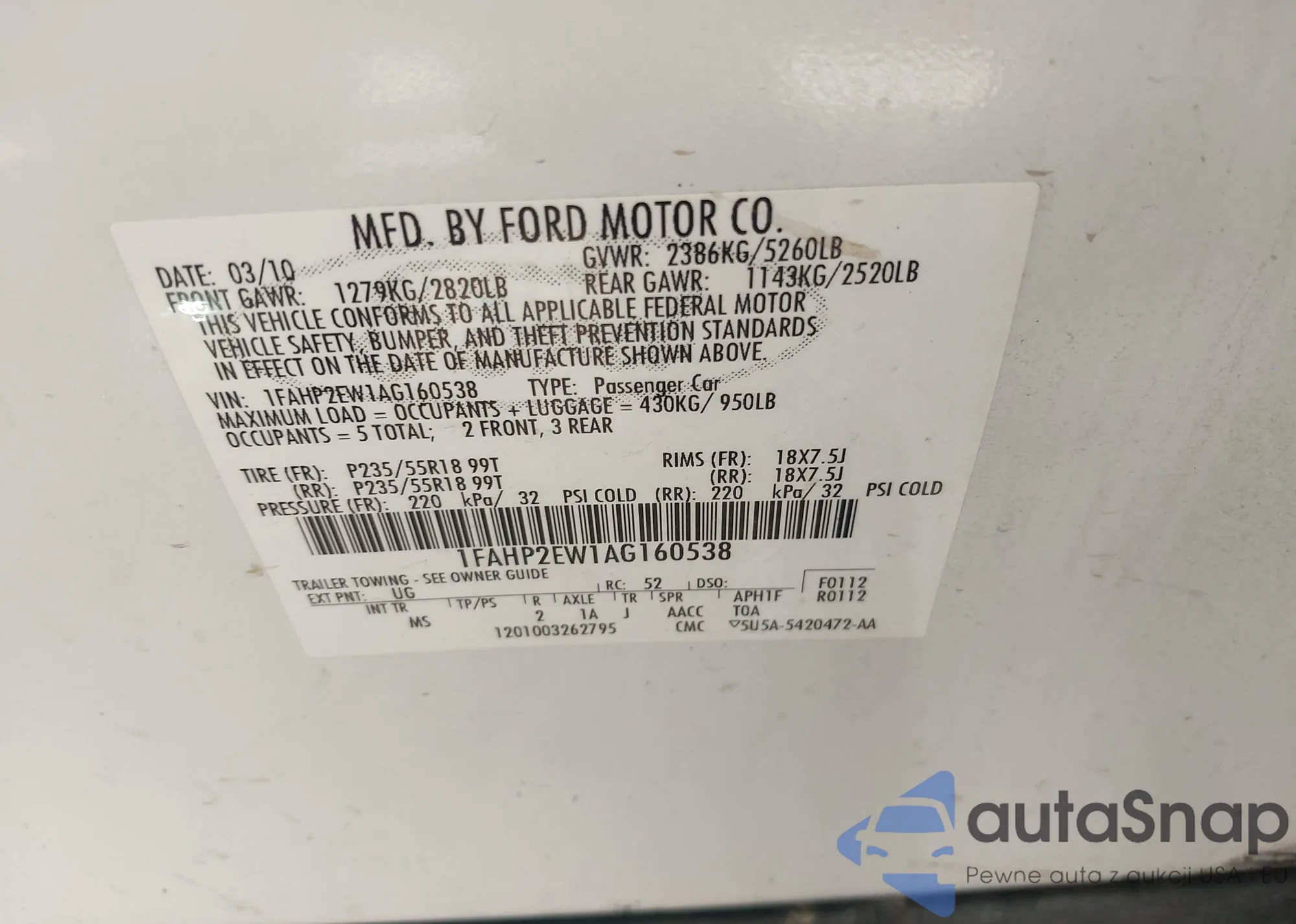 LOT: 68757295 VIN: 1FAFP55U71G198976