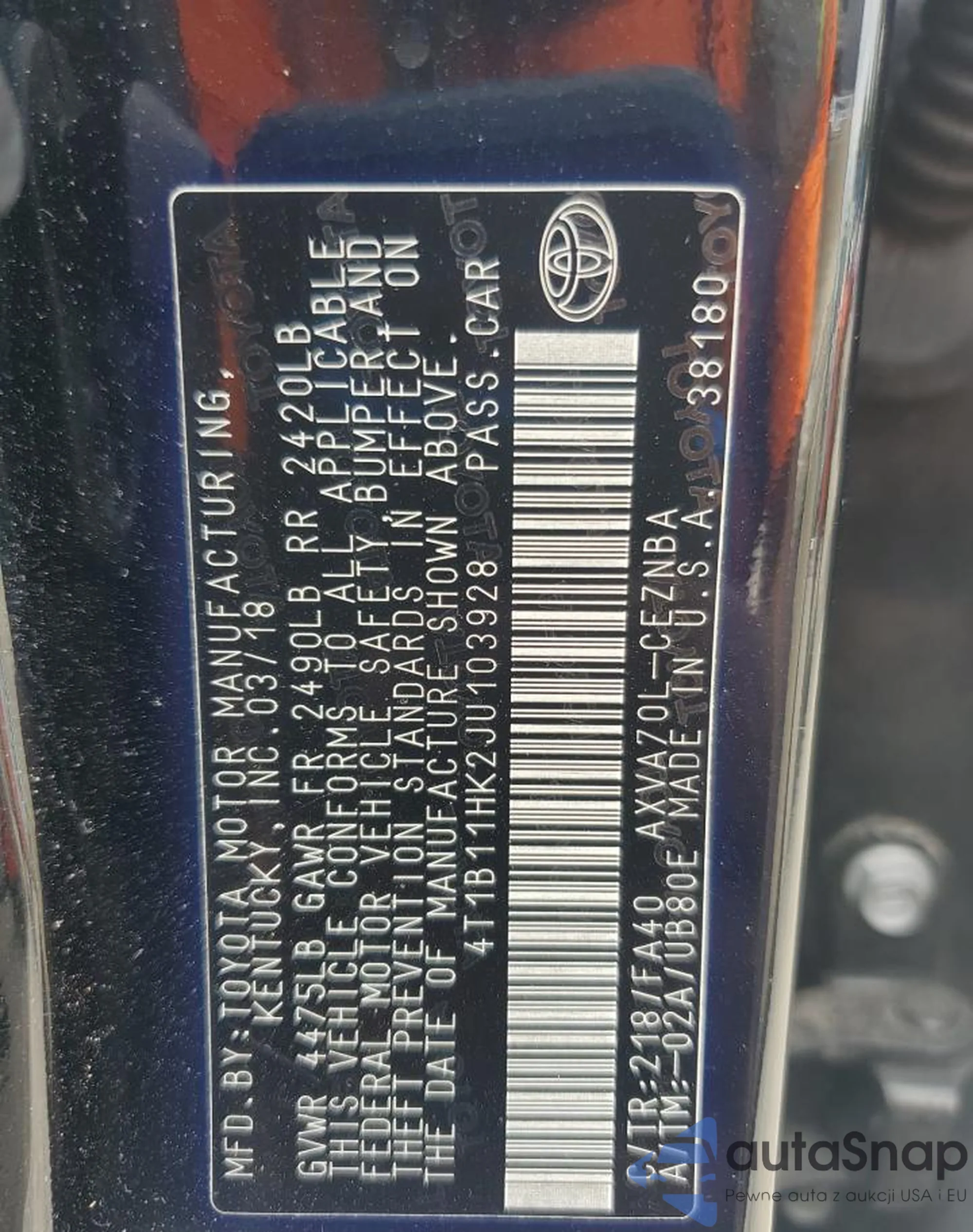 LOT: 80338715 VIN: 4T1B11HK2JU103928