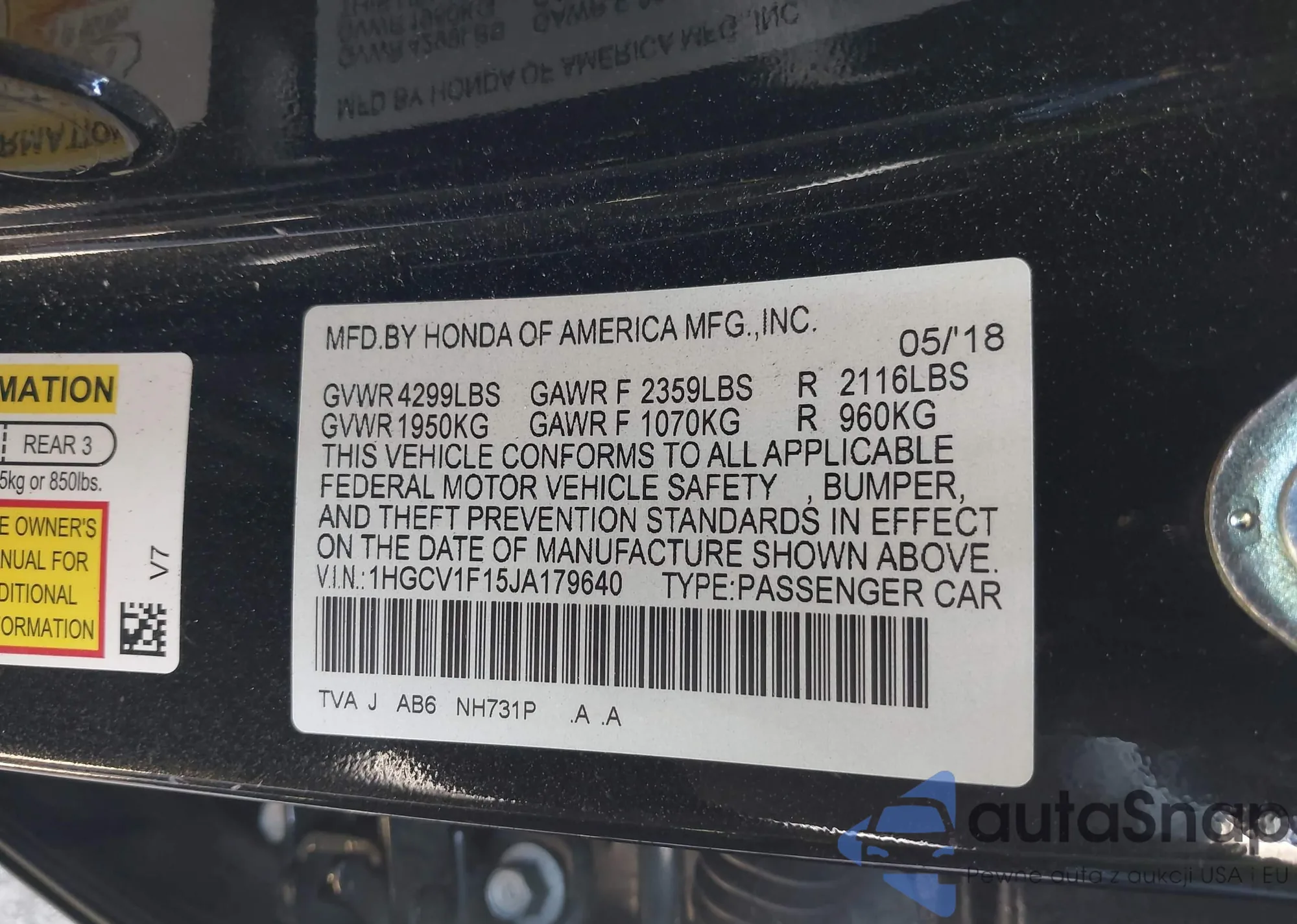 LOT: 43221092 VIN: 1HGCV1F15JA179640
