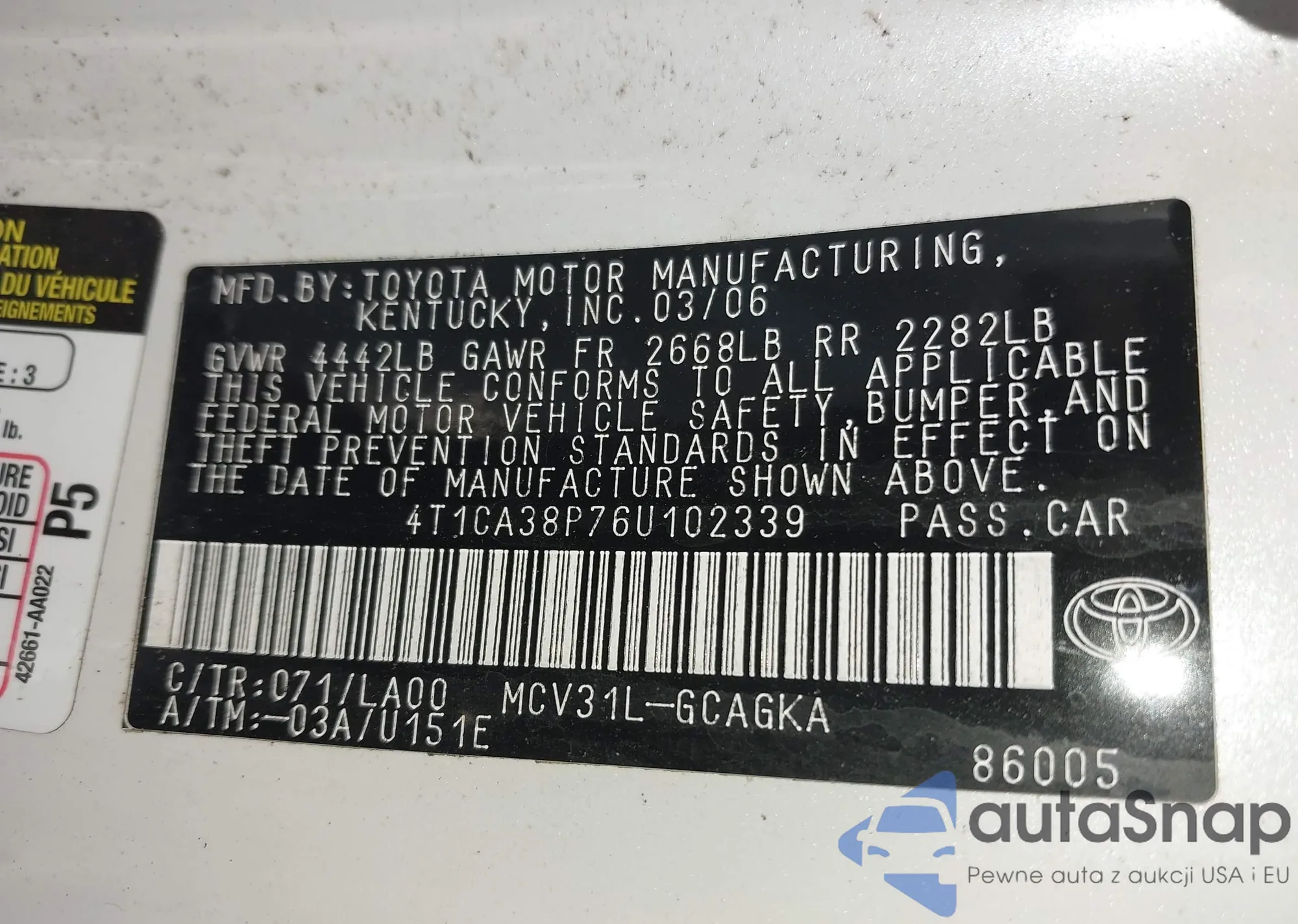 • VIN 4T1CA38P76U102339