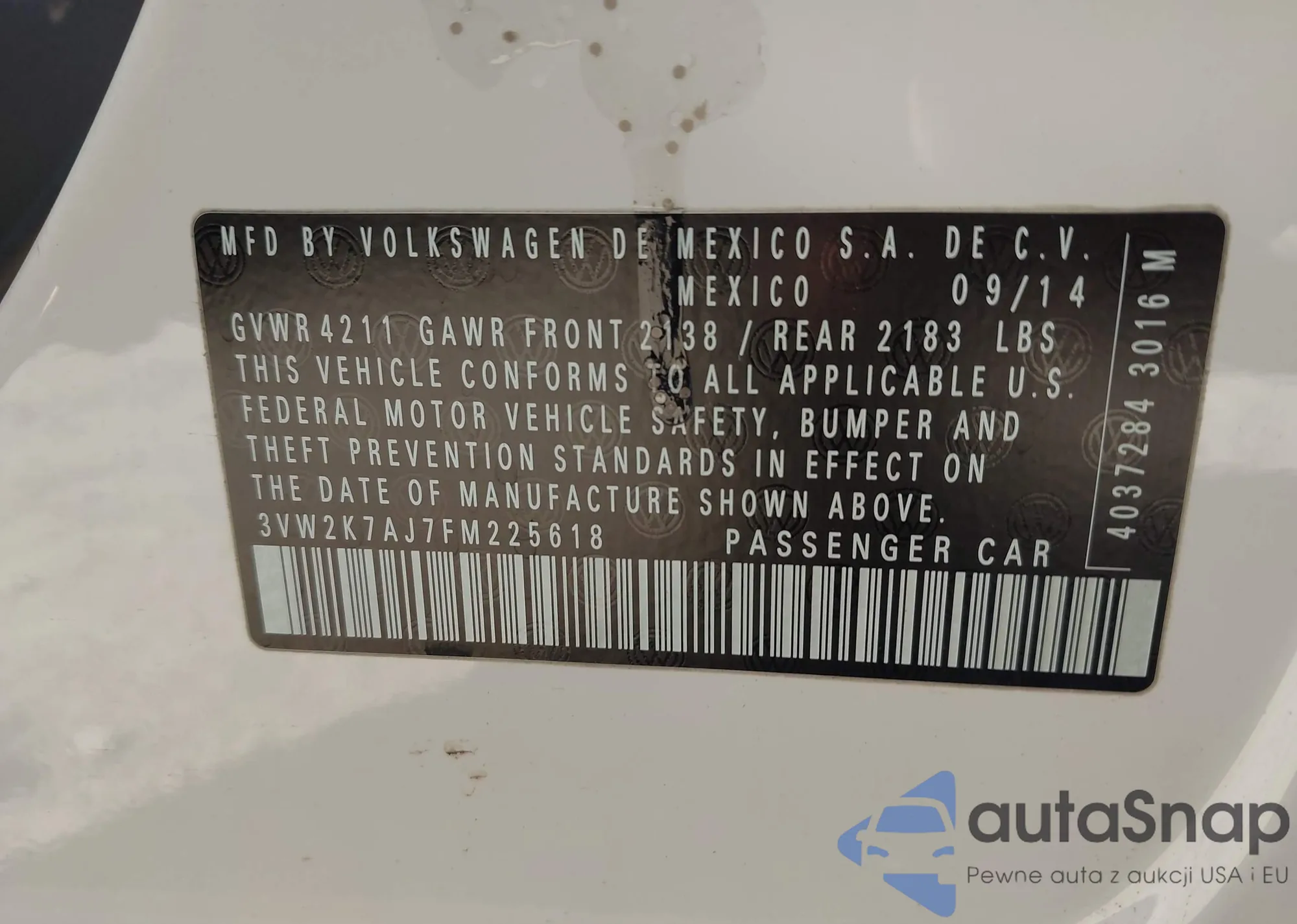 • VIN 3VW2K7AJ7FM225618