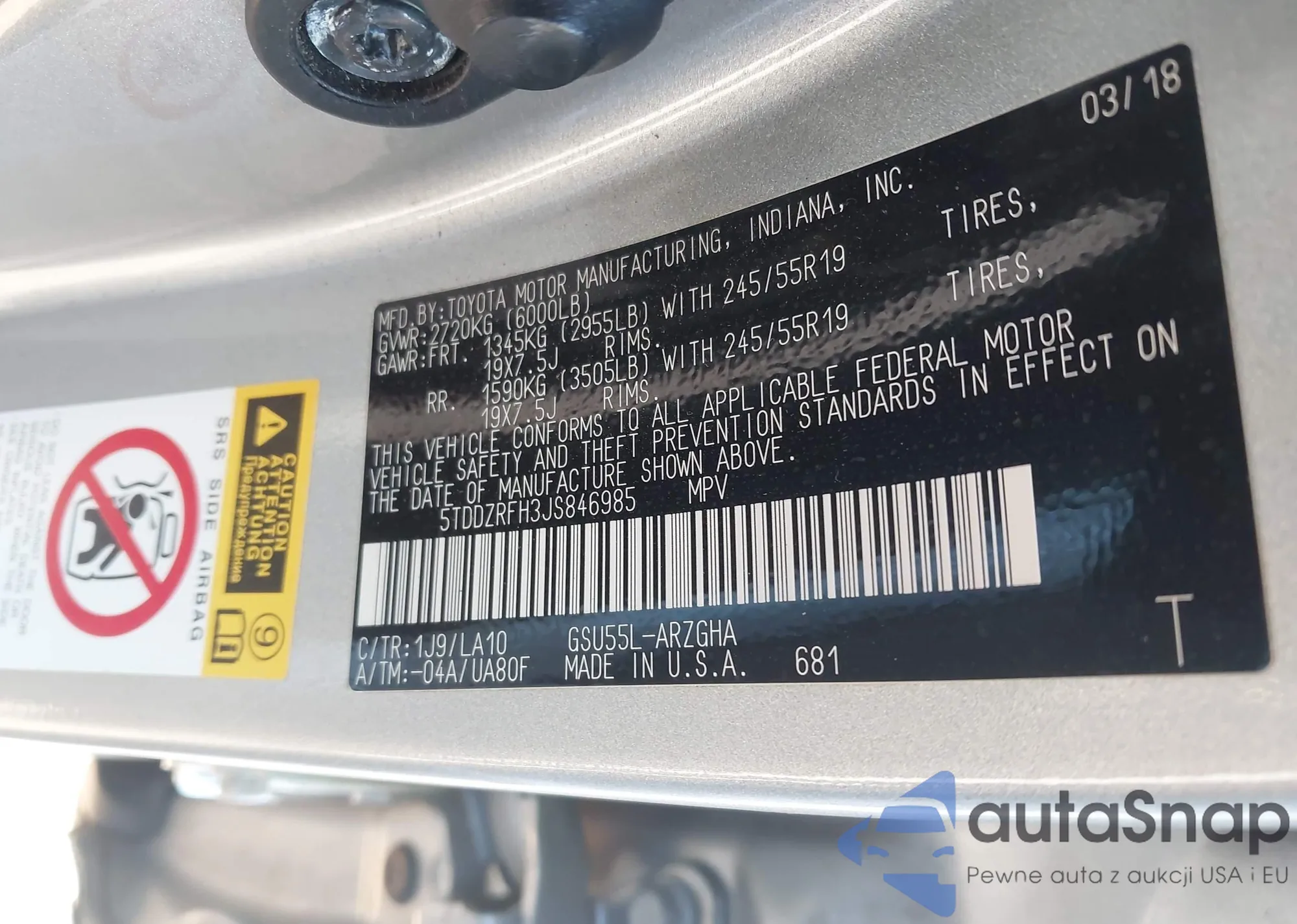 LOT: 43091767 VIN: 5TDDZRFH3JS846985