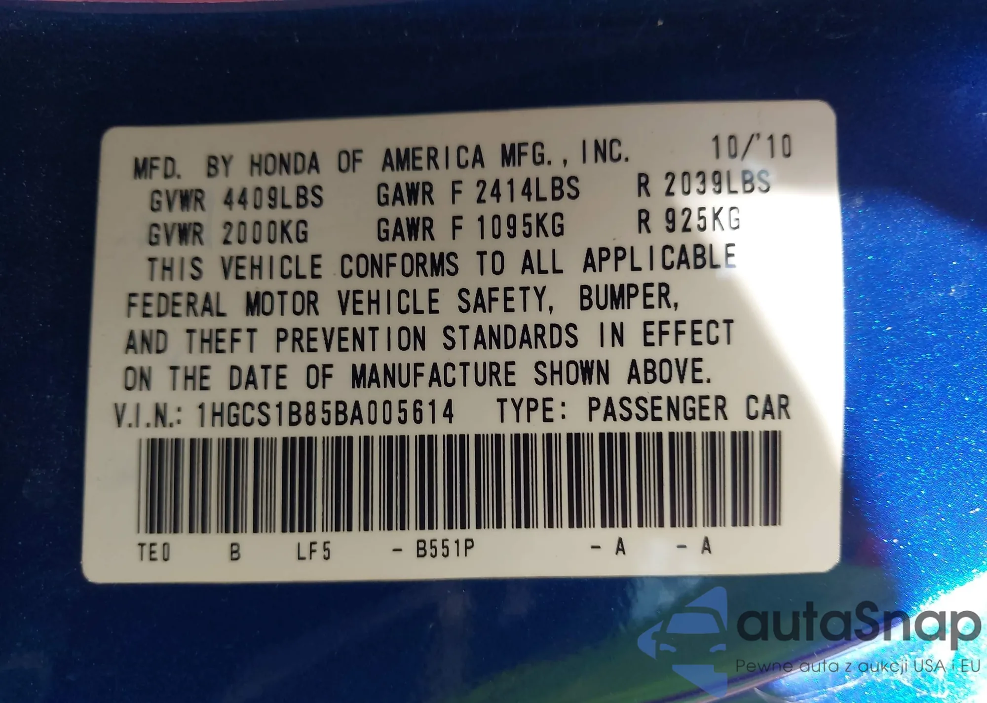 LOT: 43111983 VIN: 1HGCS1B85BA005614