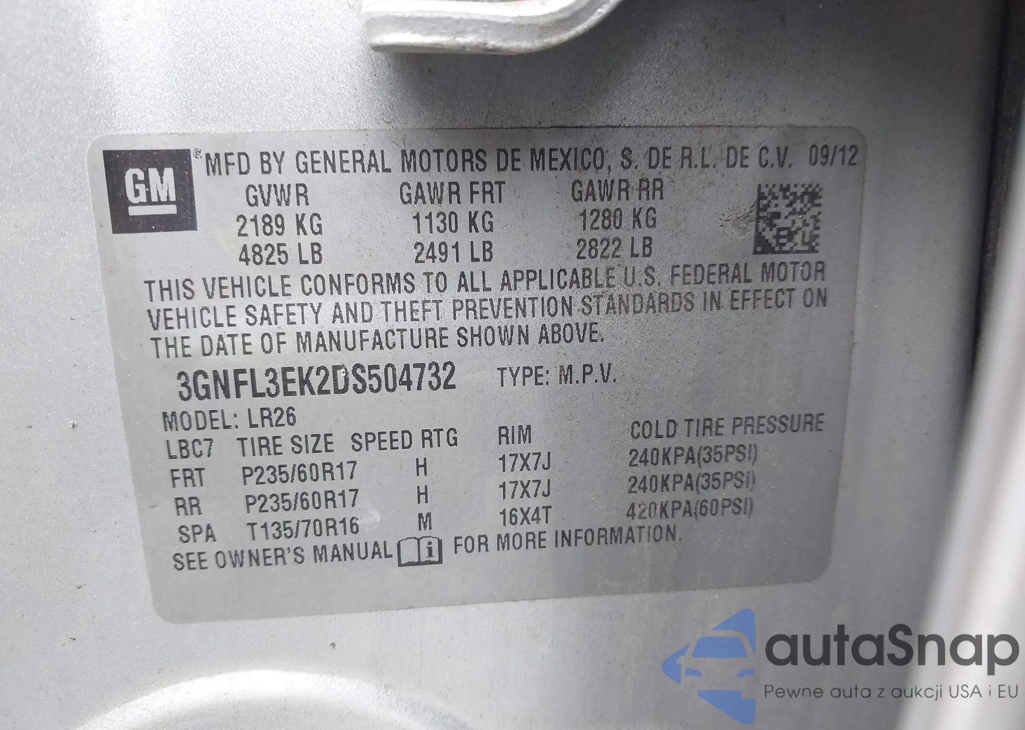 LOT: 42980306 VIN: 3GNFL3EK2DS504732
