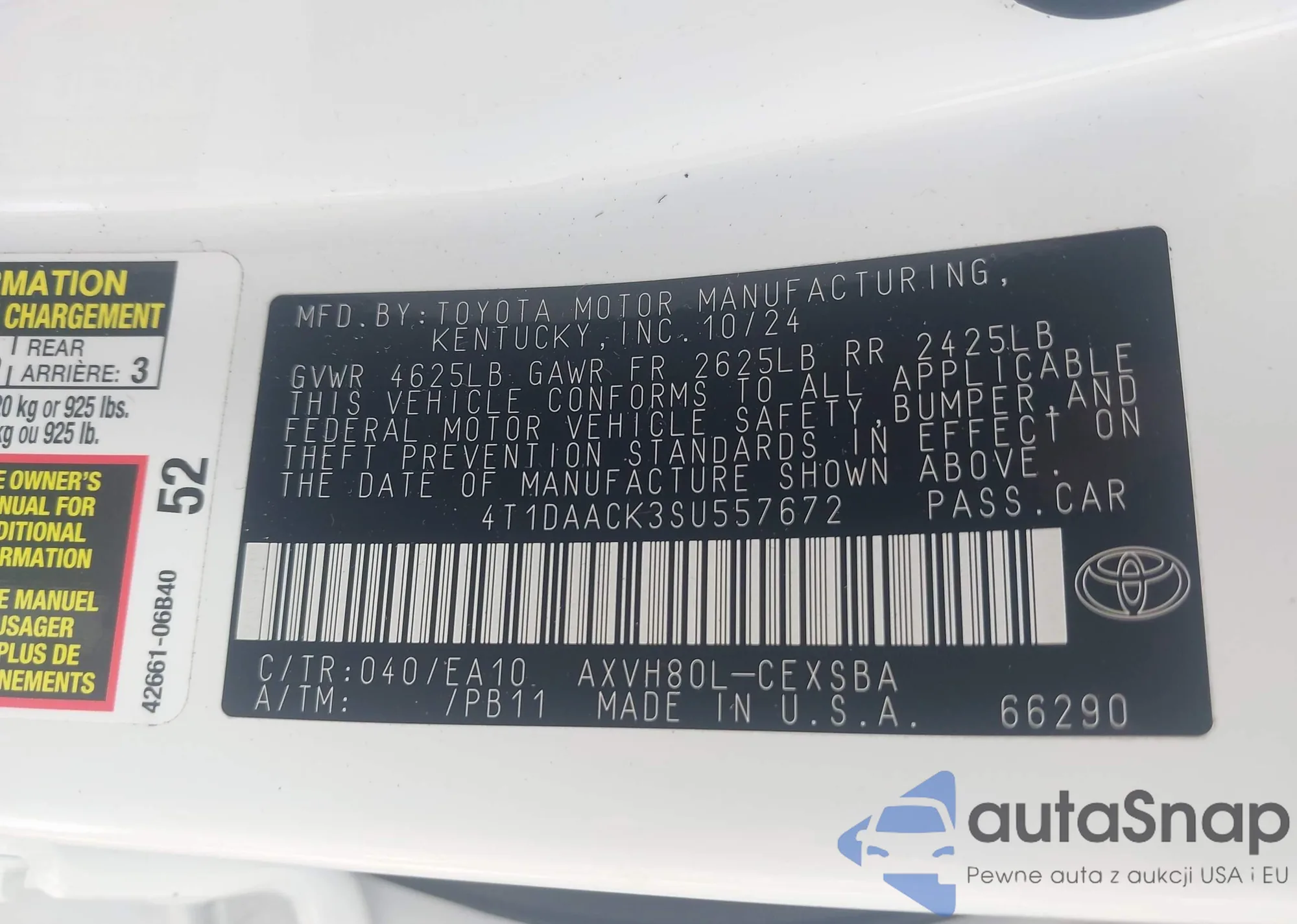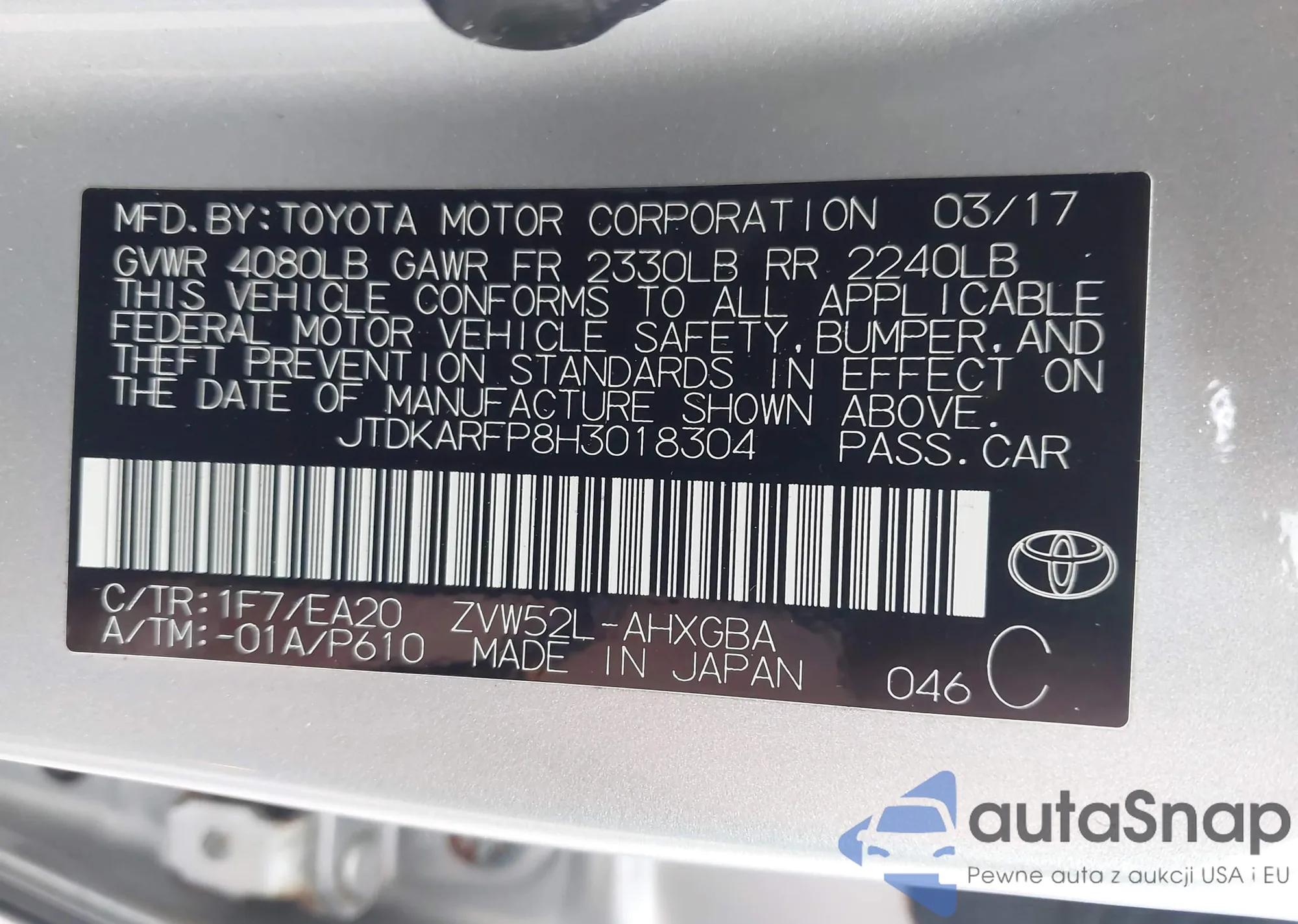 LOT: 43233244 VIN: JTDKARFP8H3018304