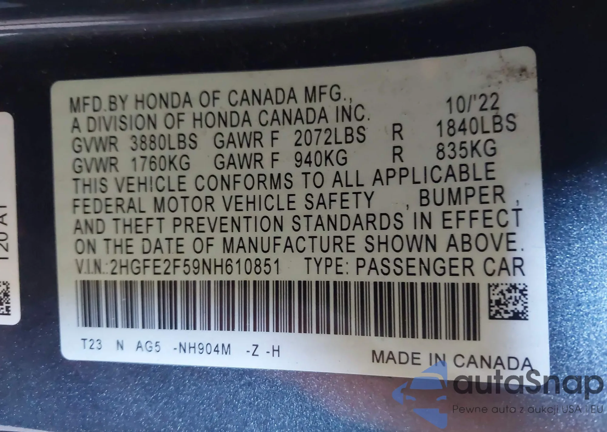 • VIN 2HGFE2F59NH610851
