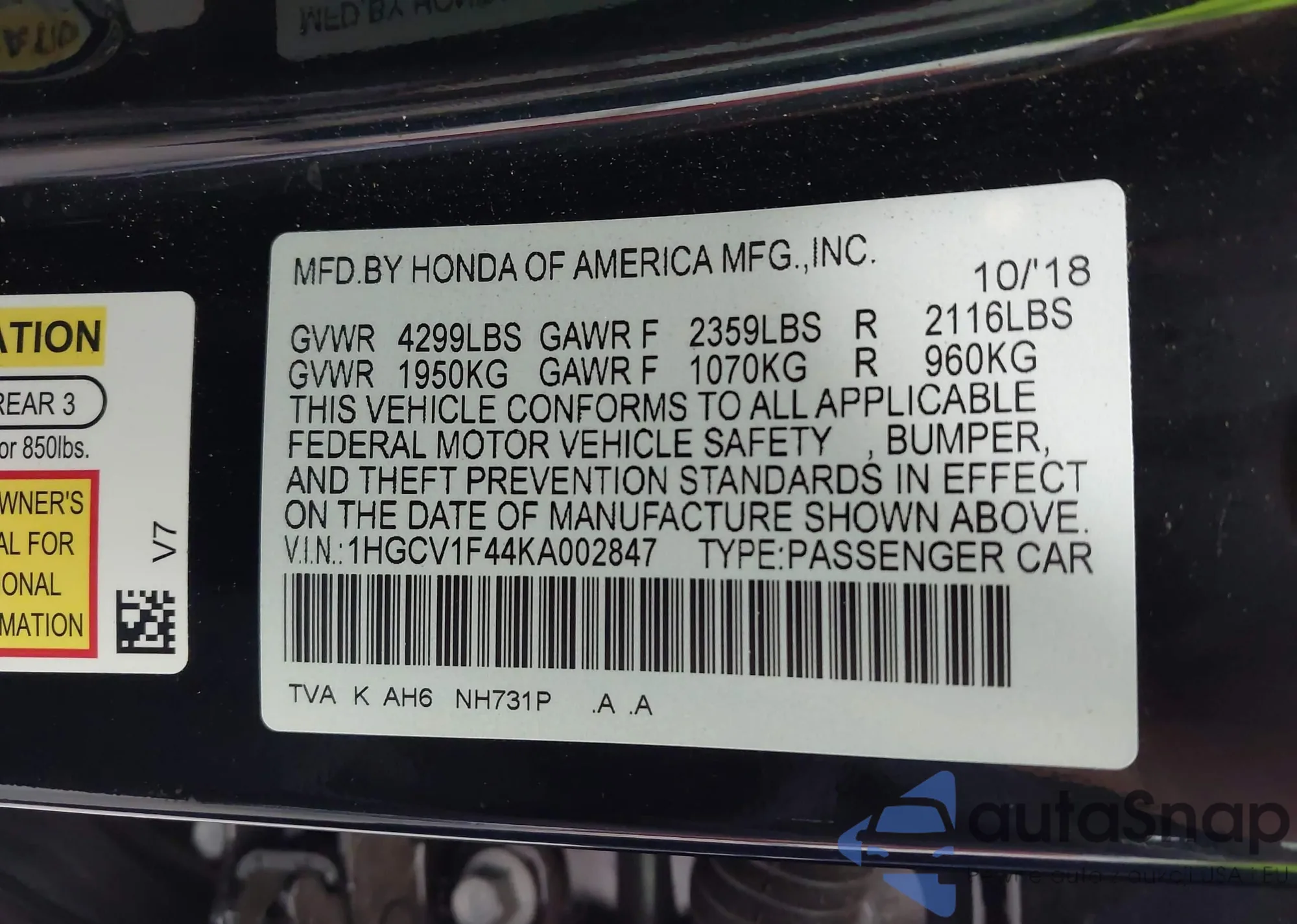 • VIN 1HGCV1F44KA002847
