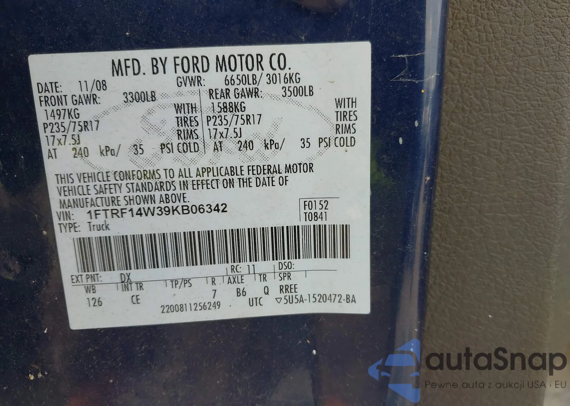 LOT: 43154211 VIN: 1FTRF14W39KB06342