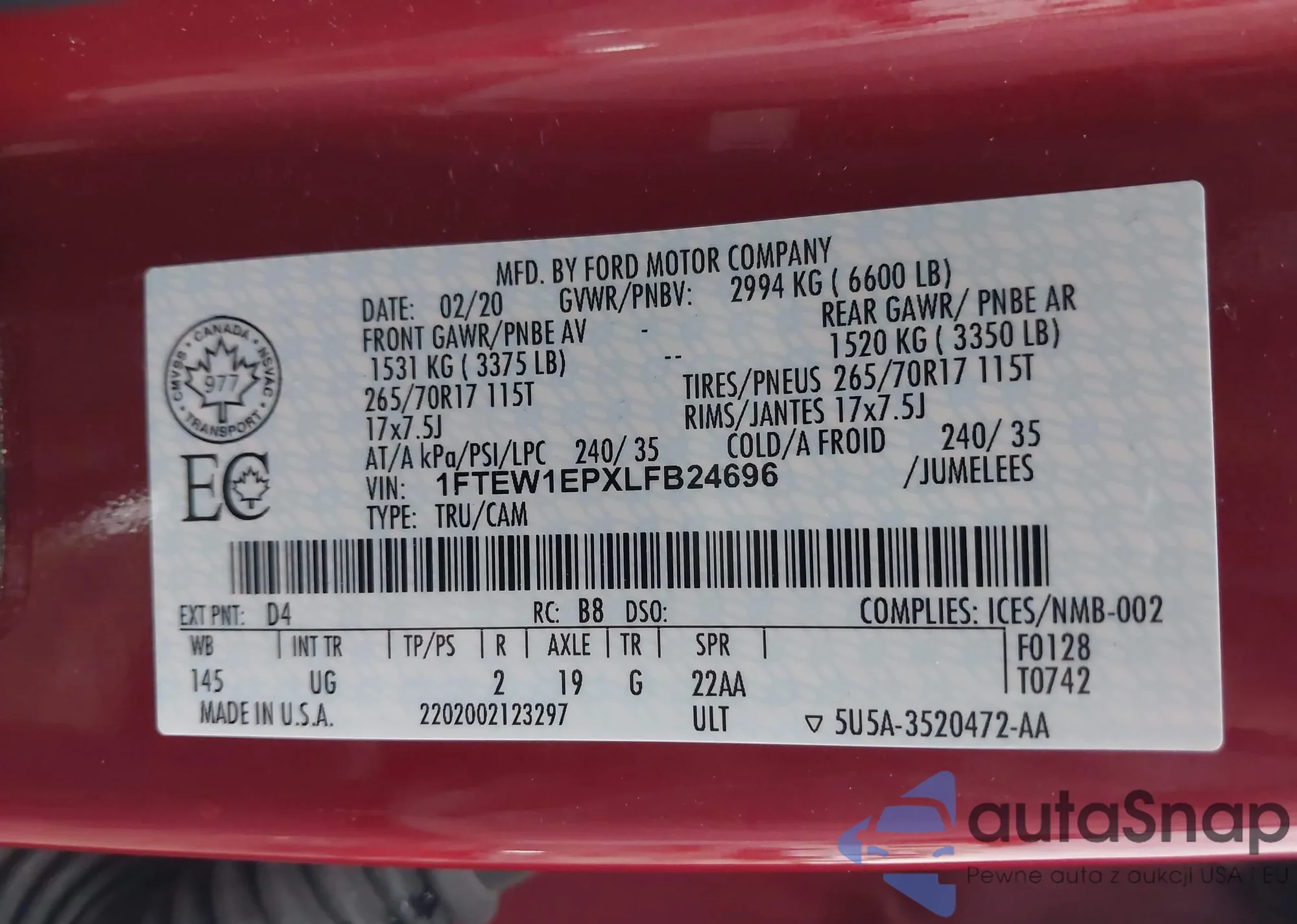 LOT: 42633954 VIN: 1FTEW1EPXLFB24696