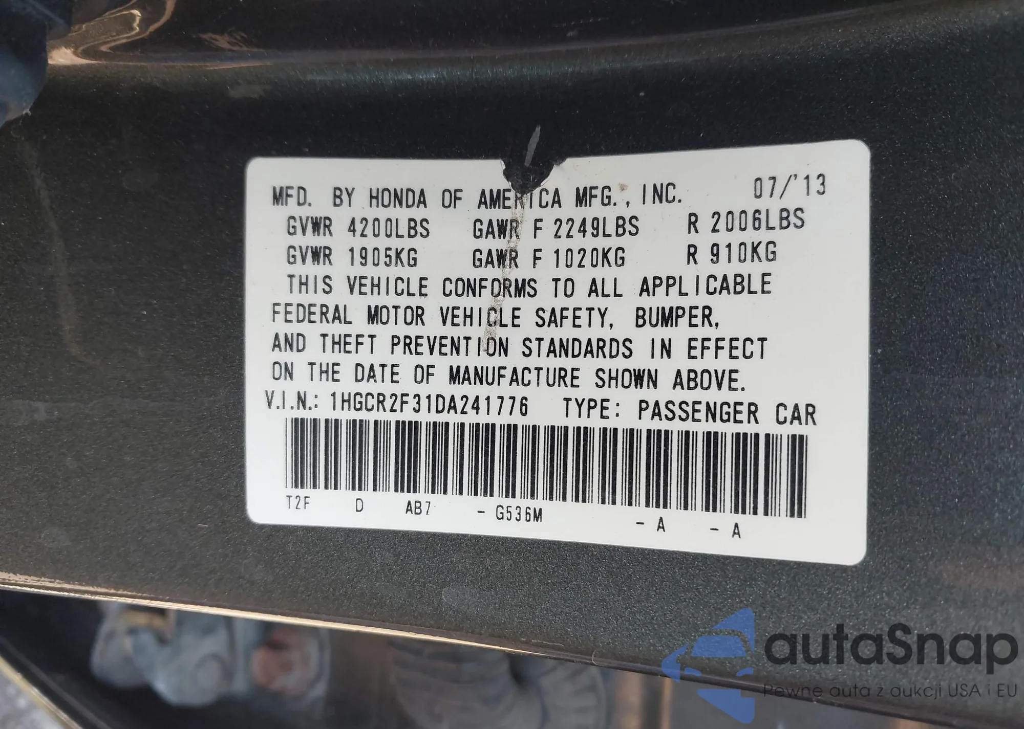 LOT: 43198304 VIN: 5FNYF4H97DB010642