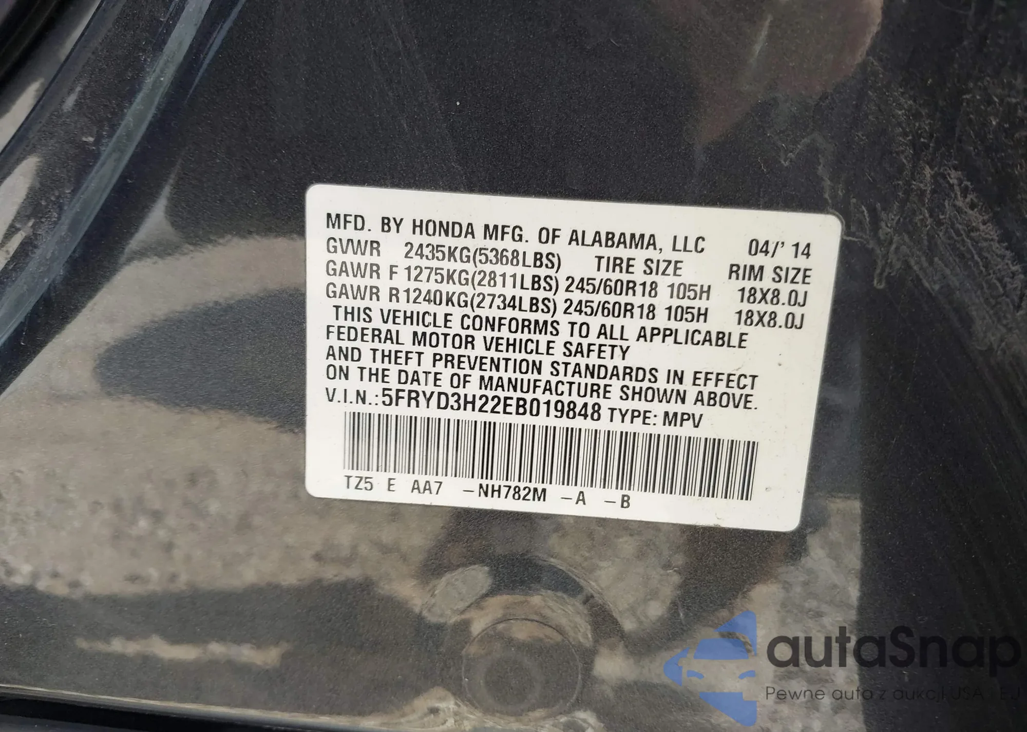 • VIN 5FNYF4H97DB010642