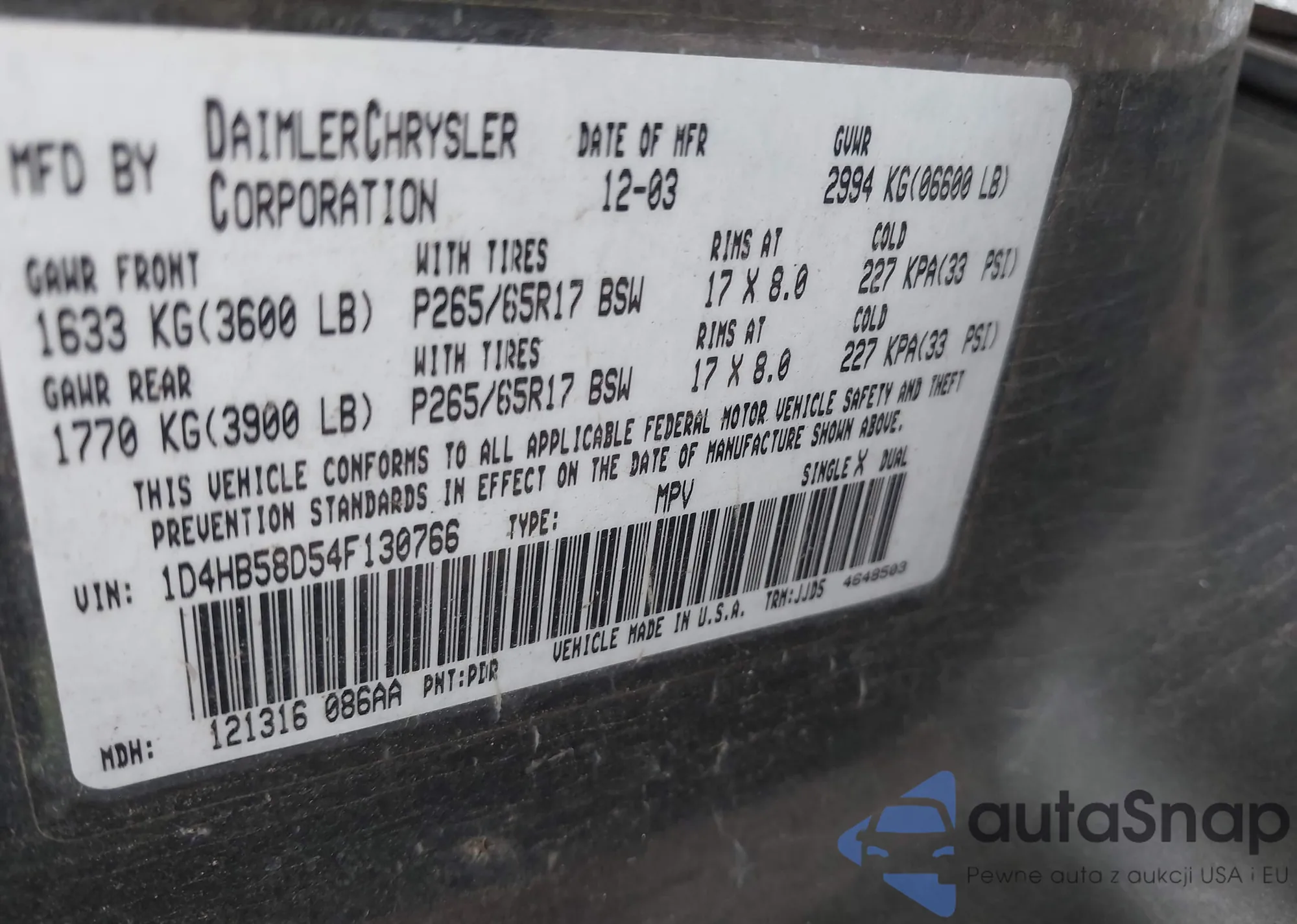 LOT: 43273662 VIN: 1D4HB58D54F130766
