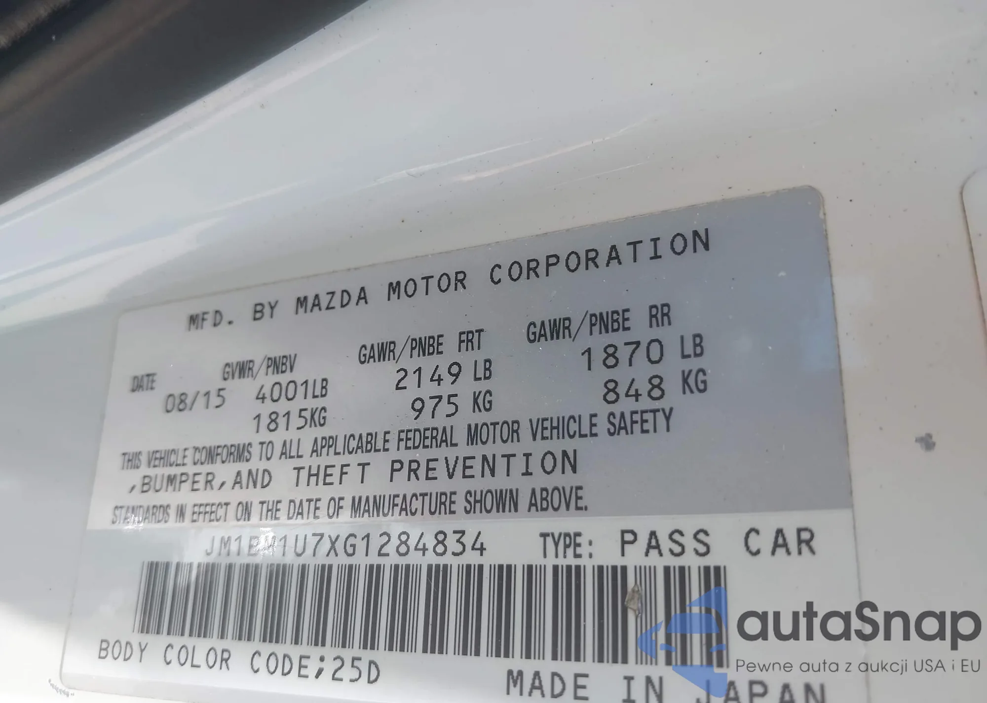LOT: 43035869 VIN: JM1BM1U7XG1284834