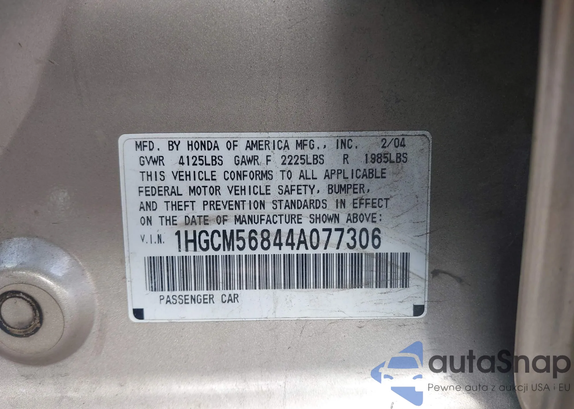 LOT: 43109879 VIN: 1HGCM56844A077306