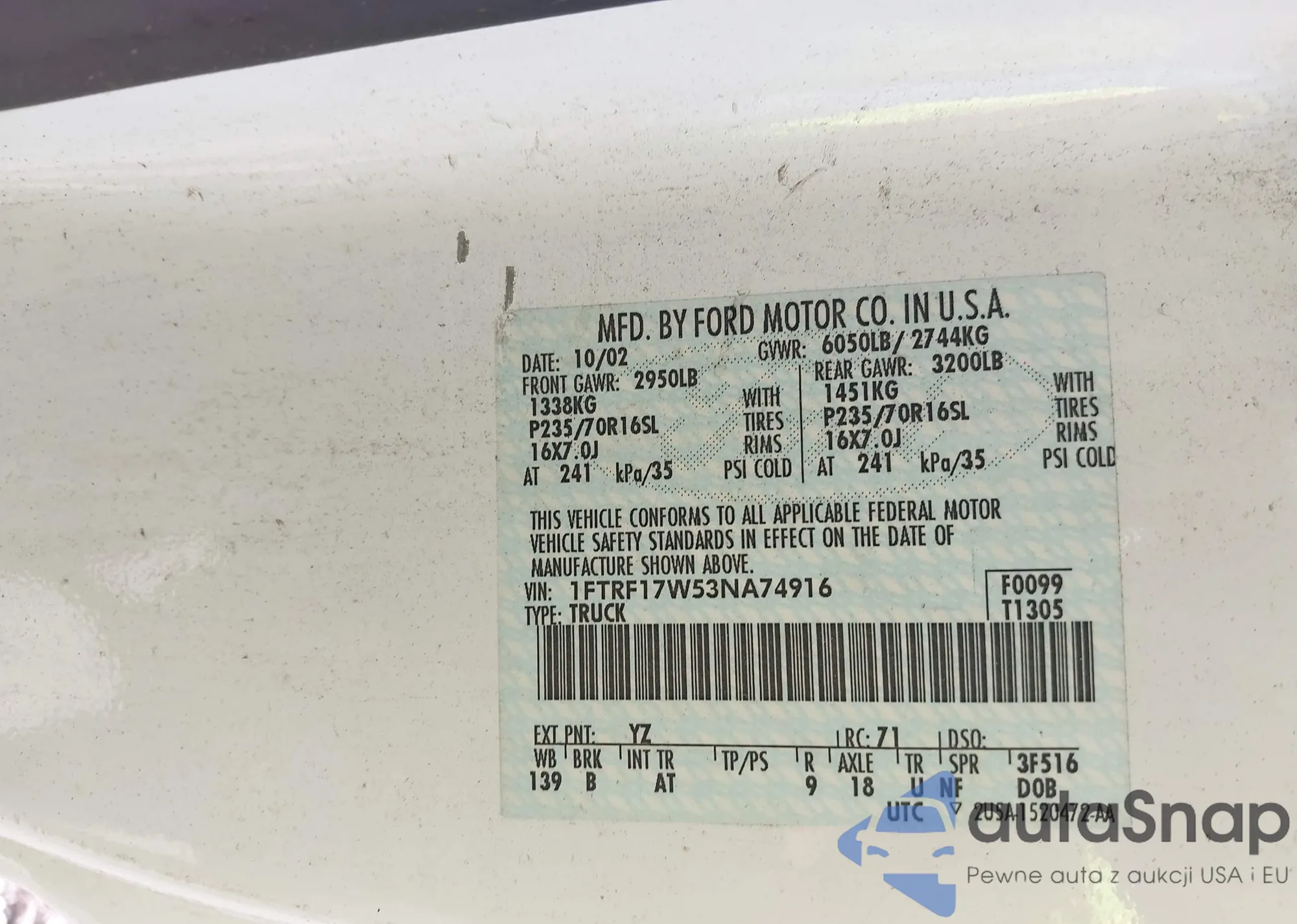 LOT: 42913798 VIN: 1FTRF17W53NA74916