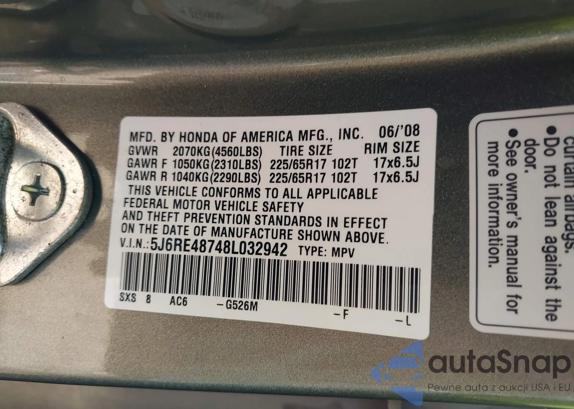 • VIN 5J6RE48748L032942