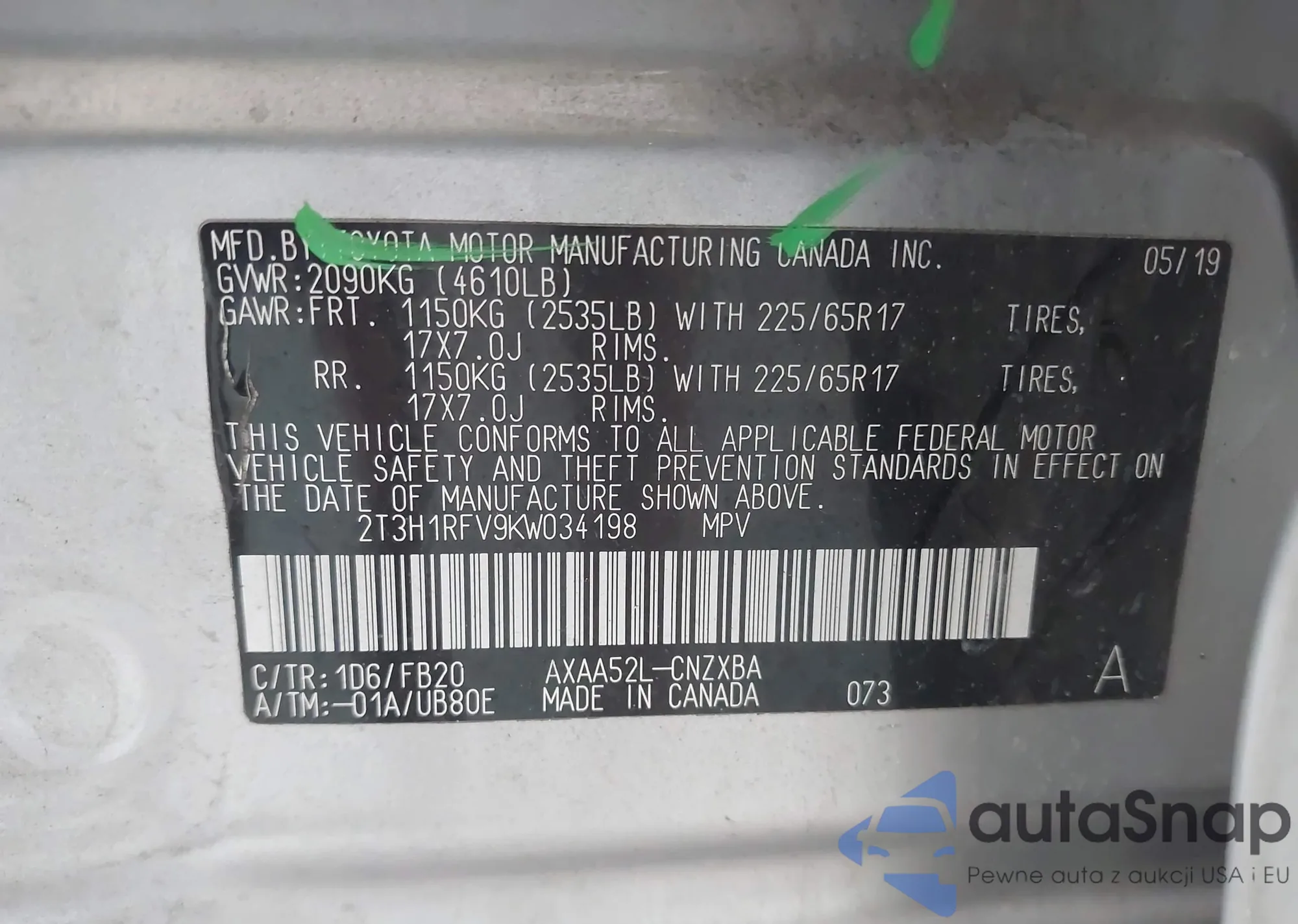 • VIN 2T3H1RFV9KW034198