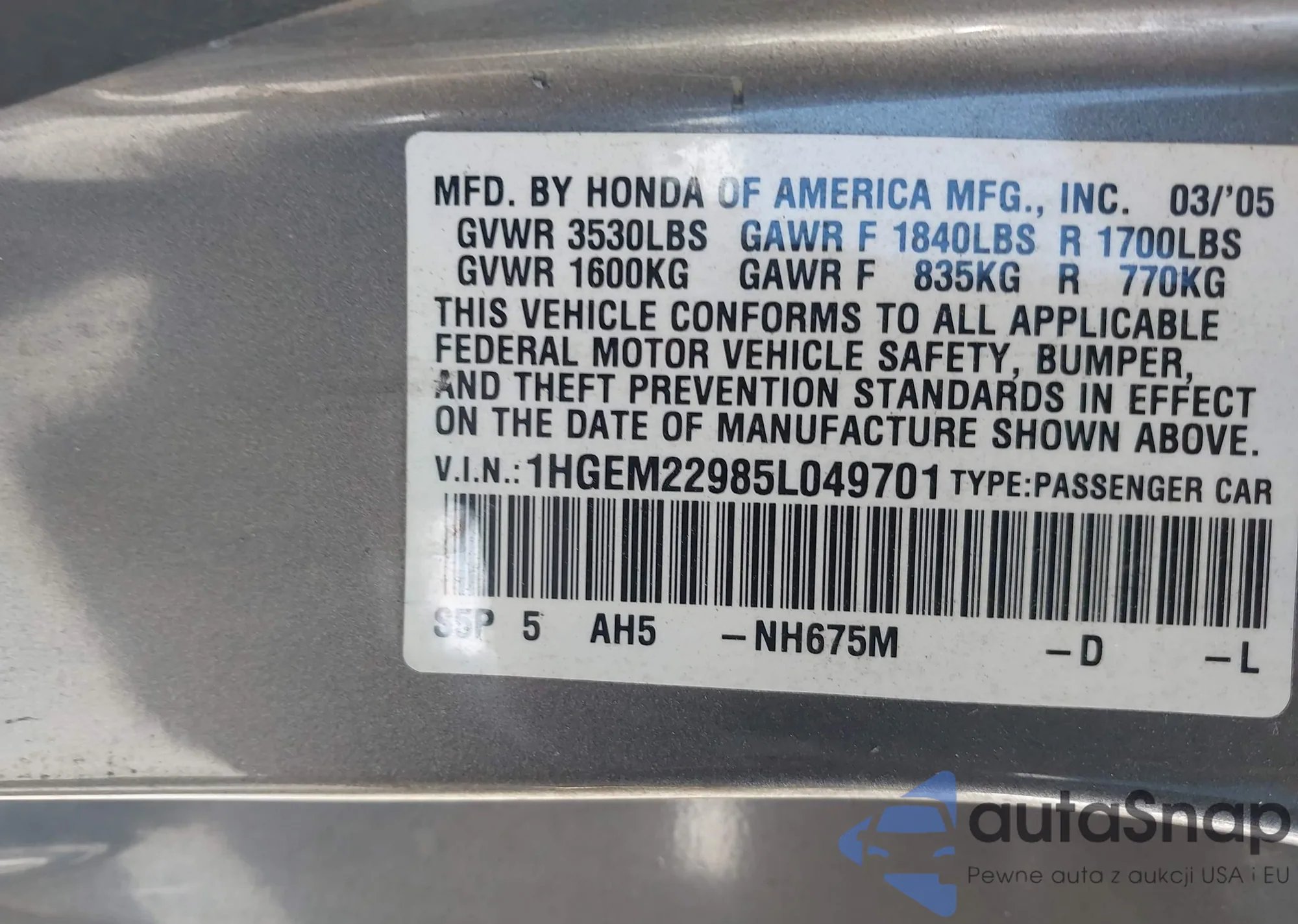 LOT: 43104793 VIN: 1HGEM22985L049701