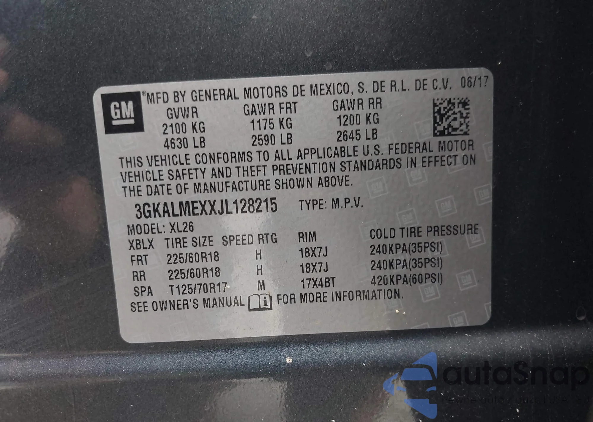 • VIN 3GKALMEXXJL128215