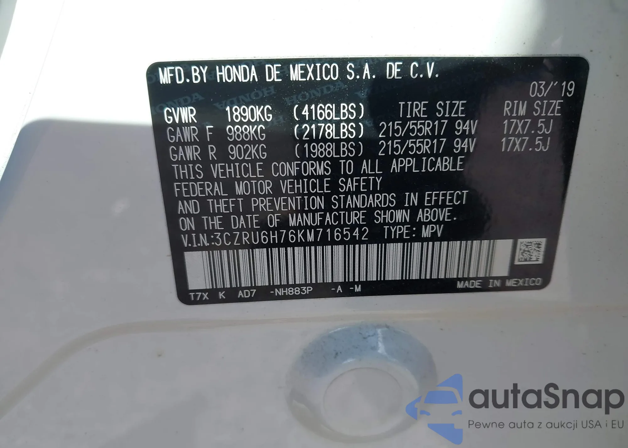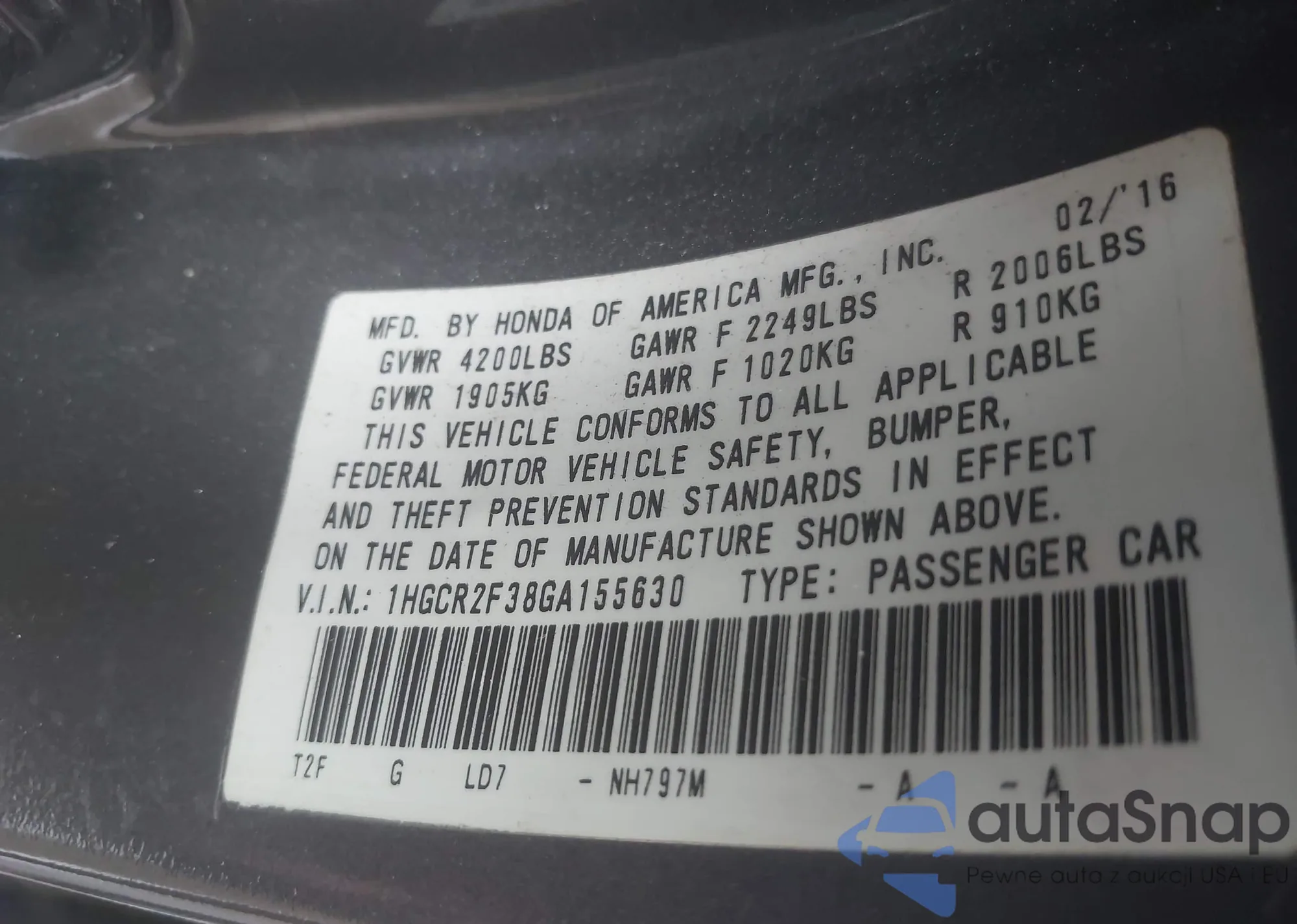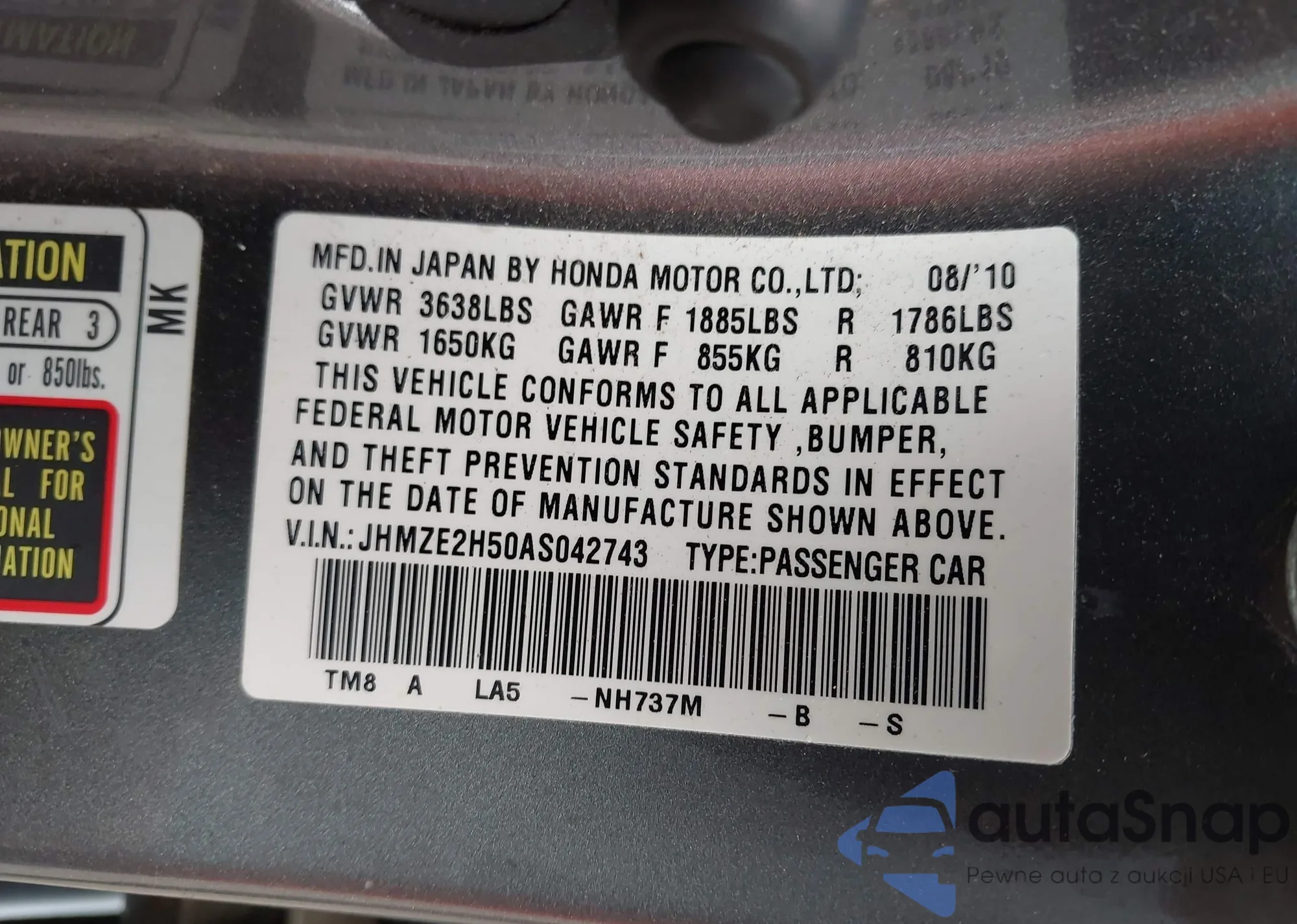 LOT: 43211812 VIN: JHMZE2H50AS042743