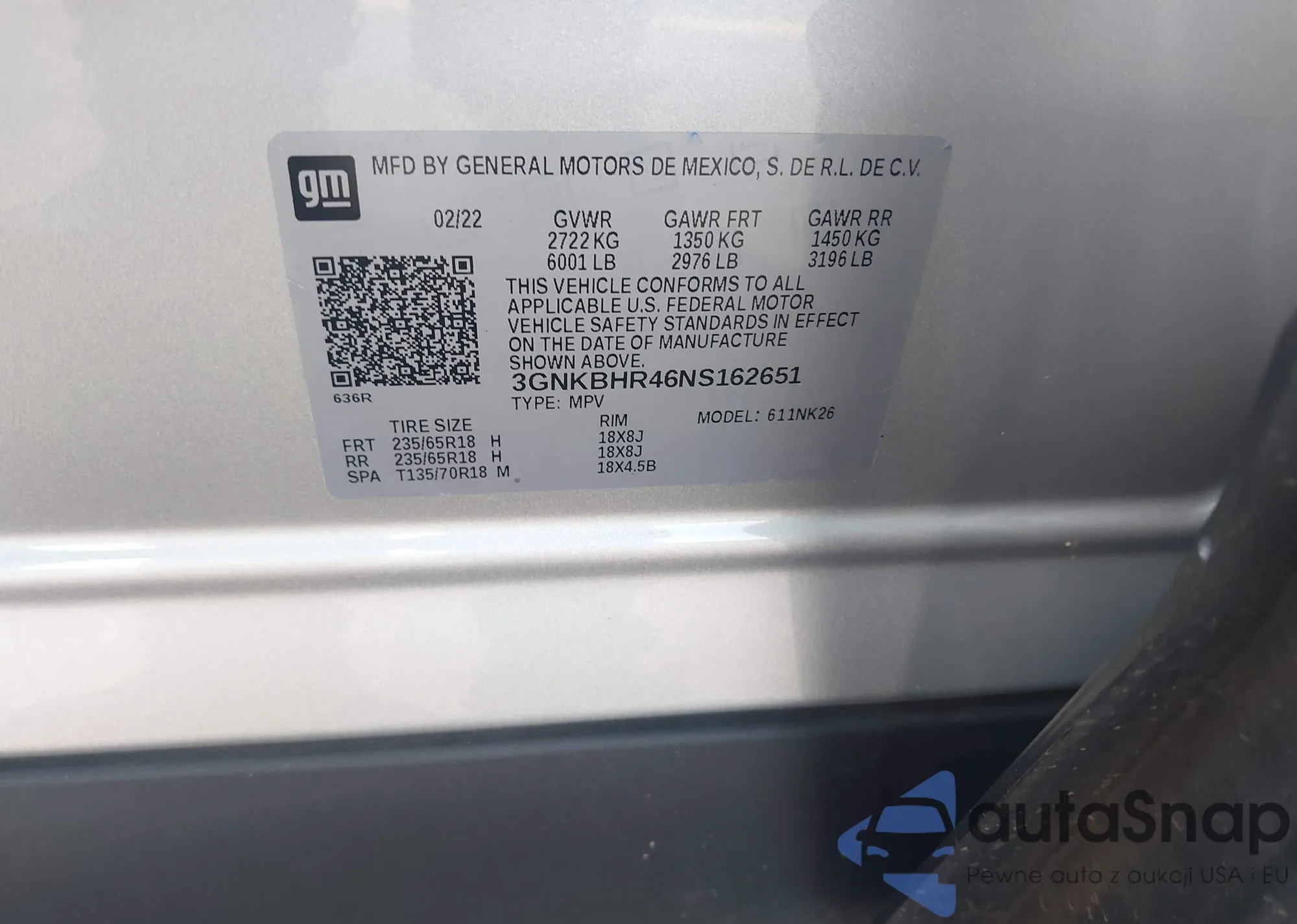 LOT: 43167239 VIN: 3GNKBHR46NS162651
